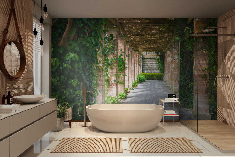 Ceea ce este grozav este modul în care se îmbină acei stâlpi de piatră clasici, plini de soare, cu verdeața vibrantă; este oarecum magic. Poate că sunteți un locuitor al orașului sau doar cineva care adoră o felie de aer liber în interior – această pictură murală vă oferă acea vibrație răcoritoare a pământului fără a avea nevoie de un deget verde. Gândiți-vă doar că vă treziți în fiecare zi în fața acestui peisaj, ca în propria voastră mică Narnia!