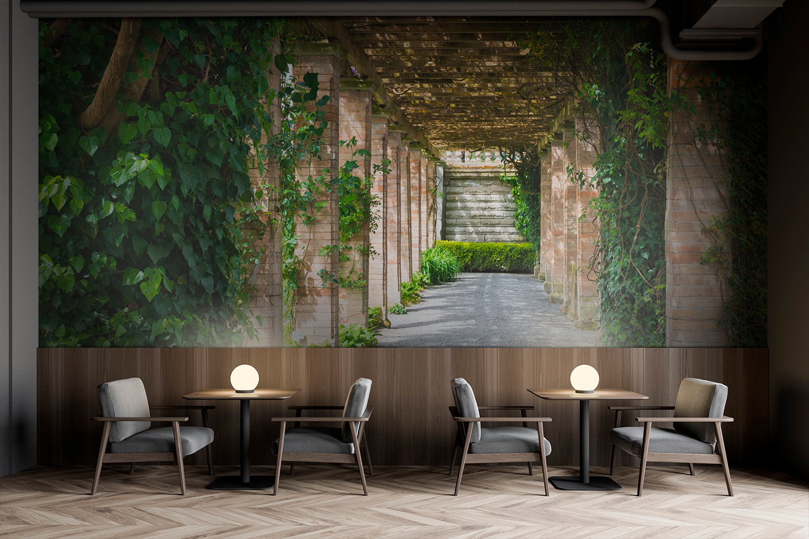Ai visat vreodată să ai o grădină secretă chiar în sufrageria ta? Această pictură murală “Rând de stâlpi cu viță de vie crescând pe ei” este ca și cum ați păși într-un paradis botanic senin. Imaginează-ți că te relaxezi pe canapea și te simți ca și cum te-ai plimba pe această cărare cu frunze, stâlpi înveliți în verdeață luxuriantă. Este perfect pentru a adăuga profunzime și o notă de natură oricărui spațiu – camera dvs. pare instantaneu mai expansivă.