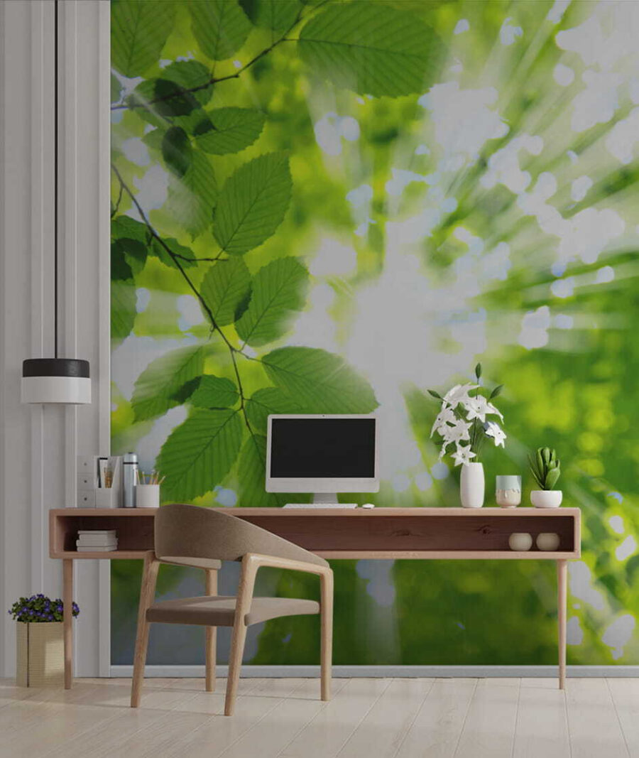 Felul în care lumina filtrează prin aceste frunze – este magie pură, aproape ca și cum ai simți căldura pe fața ta. Este nemaipomenit de senină, ca și cum modul naturii de a vă îmbrățișa de fiecare dată când intrați în cameră. Ideală pentru un dormitor, un birou acasă sau acel colțișor de lectură pe care tot promiți că îl vei folosi mai mult. Această pictură murală nu este doar decor; este o mică felie de liniște chiar pe peretele tău. Să fim cu toții de acord: cine nu are nevoie de mai mult de asta?