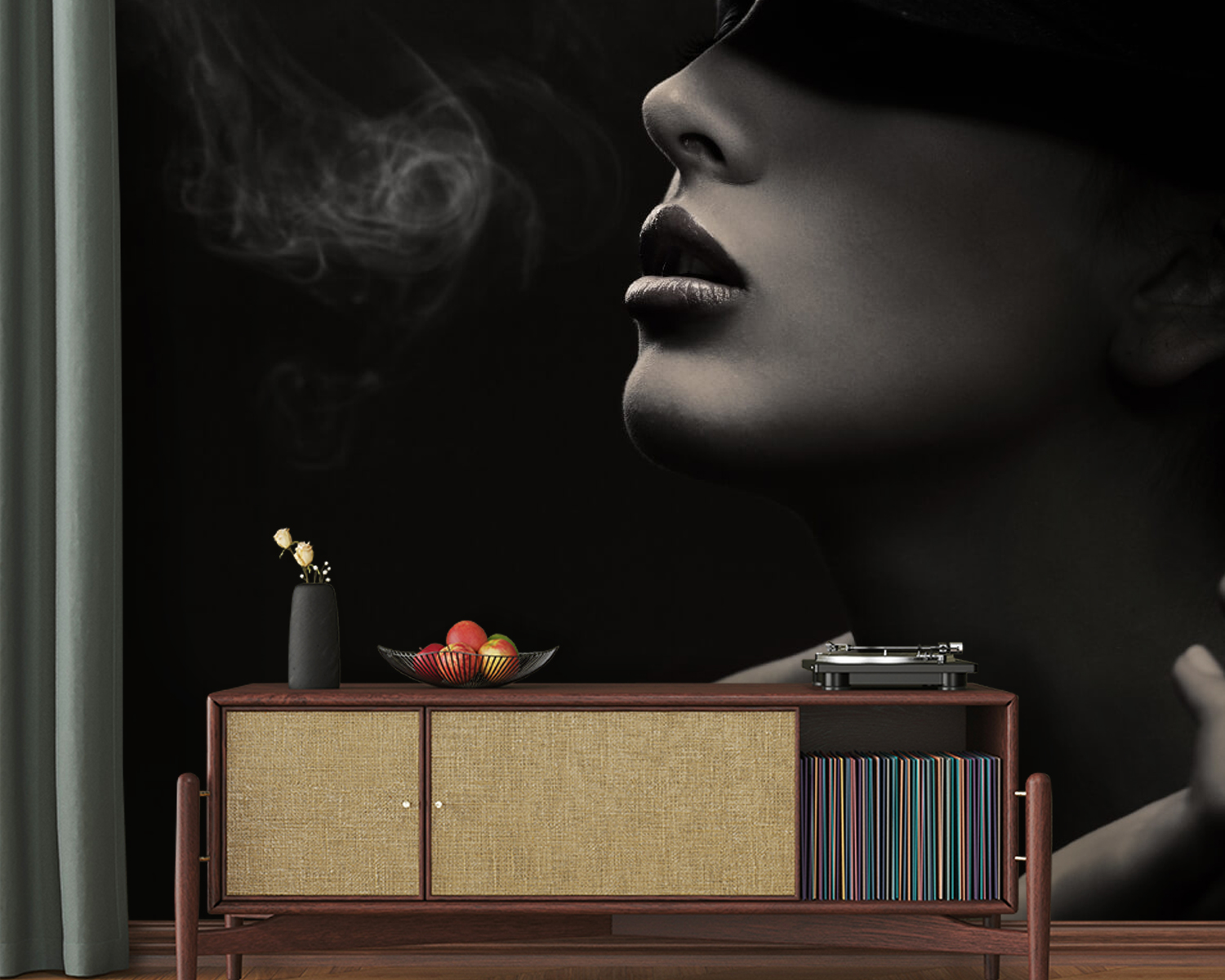 Transformați-vă spațiul într-un paradis artistic cu această pictură murală captivantă a unei femei cu pălărie, care fumează relaxată. Este ca și cum ai păși într-o cafenea elegantă, unde fiecare colț șoptește eleganță și intrigă. Felul în care ea privește în depărtare, înconjurată de un vârtej de fum, adaugă o notă de mister – perfect pentru a stârni conversații interesante.