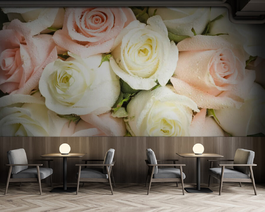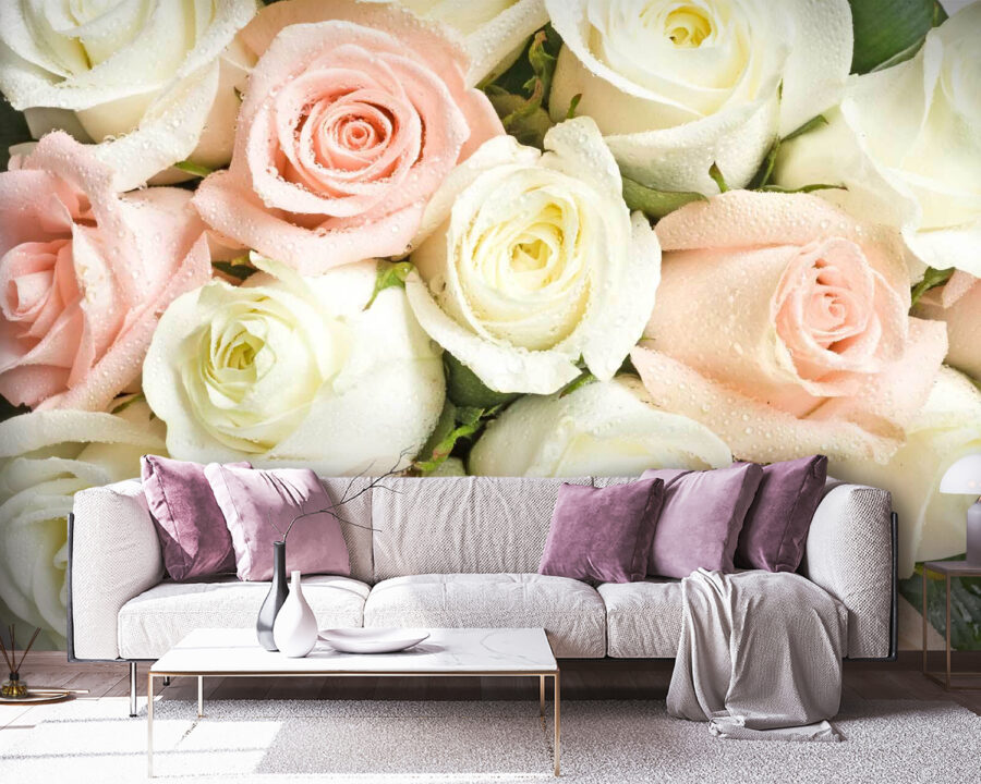 Transformați-vă spațiul cu acest tapet uimitor, care prezintă un amestec încântător de trandafiri roz și albi. Imaginați-vă că intrați într-o cameră și sunteți întâmpinați de un val de farmec floral care vă face să vă simțiți ca la o petrecere în grădină, fără a fi nevoie de stropitoare! Nuantele delicate sugerează relaxare, în timp ce picăturile de ploaie de pe petale aduc o notă răcoritoare. Perfect pentru un colț de lectură confortabil sau un living plin de viață, este ca și cum ați avea frumusețea naturii la îndemână. Cine nu ar zâmbi la o priveliște atât de veselă? Este timpul să aduceți natura în interior și să lăsați trandafirii să-și facă magia!
