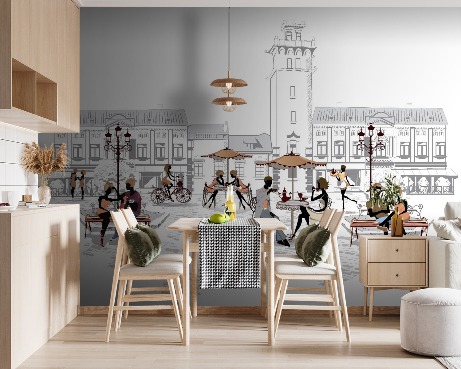 Imaginați-vă acest lucru: o scenă stradală fermecătoare care aduce o mică felie de viață chiar în casa dvs. Această pictură murală surprinde o zi însorită în care un bărbat și o femeie stau pe o bancă confortabilă, înconjurați de zumzetul unei cafenele aglomerate. Imaginați-vă clinchetul ceștilor de cafea, râsetele prietenilor și adierea unei brize blânde. Este perfect pentru oricine iubește vibrația vieții de oraș sau vrea doar să evadeze într-un moment pitoresc. Această piesă nu numai că încălzește o cameră, dar invită și oamenii să împărtășească povești și amintiri, stârnind conversații precum cele care au loc în pictură. Un starter de conversație sigur!
