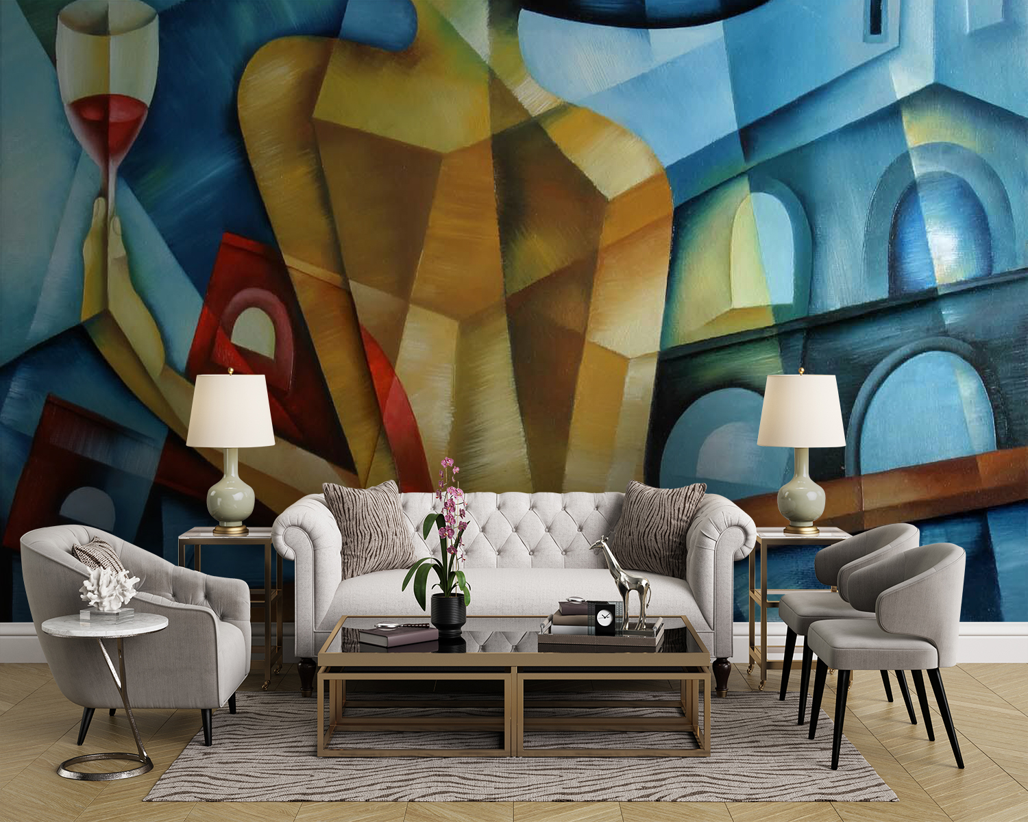Imaginați-vă această pictură murală care vă întâmpină în fiecare dimineață – o doamnă cu un pahar de vin în mână, pierdută în gândurile ei. Imaginați-vă prezența ei îndrăzneață pe peretele dvs., cu aceste tușe de acuarelă care se amestecă și se rotesc, creând o atmosferă relaxată și ușor sofisticată. Este ca și cum ai avea un companion liniștit și elegant în spațiul tău. Culorile sunt de vis, în principal albastru și roșu, ceea ce o face suficient de versatilă pentru aproape orice cameră. Aceasta ar putea fi atingerea perfectă pentru camera dvs. de zi, injectând un pic de fler artistic fără a fi prea “în fața ta”. Poate vă va inspira să vă relaxați cu propriul pahar de vin la sfârșitul unei zile lungi. Nu este doar decor; este o declarație – surprinde fără efort acel moment senin de bucurie și reflecție. Cine știe? Această pictură murală ar putea deveni fundalul multor nopți confortabile și conversații sincere.