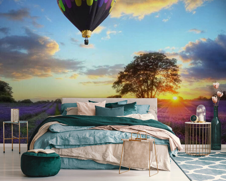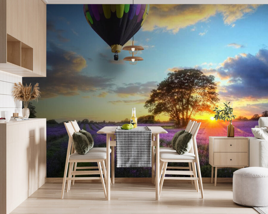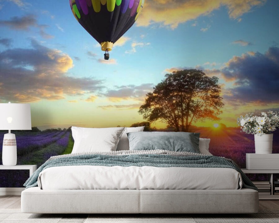 Imaginați-vă: un câmp plin de flori de lavandă vibrante, sub un cer pictat cu nuanțele calde ale apusului. Și acolo, plutind grațios deasupra tuturor, un grup de baloane cu aer cald capricioase, ca niște vise colorate ca bomboanele care își iau zborul. Acest mural nu doar decorează, ci invită pe toată lumea să viseze cu ochii deschiși și să evadeze într-o lume senină. Imaginați-vă că intrați în spațiul vostru și simțiți o briză ușoară de calm care vă învăluie, ca și cum ați pășit într-un refugiu pașnic. Este ca și cum ați avea o mini-vacanță chiar pe peretele vostru! Perfect pentru orice cameră care are nevoie de o doză de veselie, acesta șoptește povești delicate despre aventură și frumusețea naturii. Ideal pentru cei care iubesc florile, privitul cerului sau pur și simplu un strop de magie în viața de zi cu zi. Cine nu și-ar dori să plutească într-un balon colorat deasupra unei mări de lavandă?