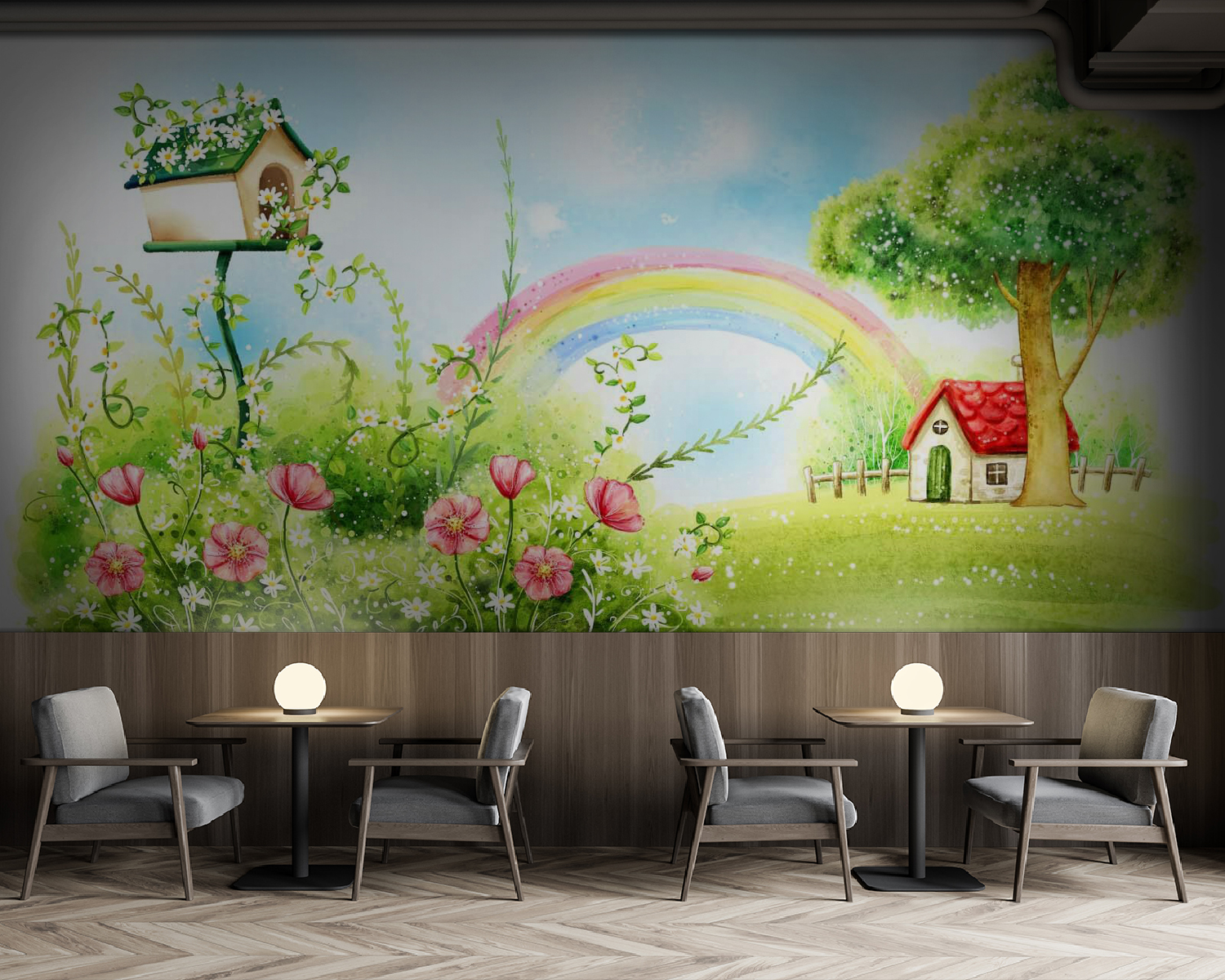 Imaginați-vă că vă treziți în fiecare dimineață la farmecul unei căsuțe cuibărită sub un copac, chiar în camera copilului dumneavoastră. Pictura murală “Casa de sub un copac” este ca o scenă desprinsă direct dintr-un basm. Verde blând, roșu vibrant – are un aer visător și fantezist. Perfect pentru a stârni niște aventuri serioase ale imaginației. Și căsuța pentru păsări învelită în flori? Prea drăguță! În plus, curcubeul adaugă un strop de magie. Este ca o lume confortabilă, fermecătoare, în care copiii tăi pot evada oricând. Gândiți-vă la povești sub copac sau la visurile cu ochii deschiși despre viața într-o casă mică. Această pictură murală este cu siguranță o scânteie de bucurie.