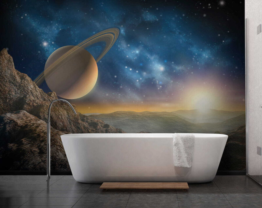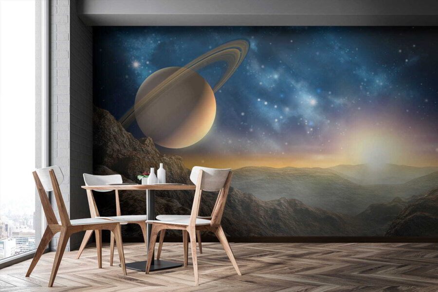 Transformați un perete simplu într-o evadare celestă cu „Fototapetul Planet cu inele în cer”. Acest fototapet uimitor vă transportă într-o priveliște de vis, unde munții maiestuoși se întâlnesc cu o planetă impresionantă, împodobită cu inele fabuloase. Imaginați-vă că vă relaxați într-un living în care razele soarelui de dimineață strălucesc, aruncând o lumină caldă peste această scenă cosmică. Este ca și cum ați avea o bucată din univers chiar acasă! Prietenii vor intra și vor rămâne cu gura căscată, în timp ce voi veți sorbi liniștiți ceaiul, simțindu-vă ca niște exploratori intergalactici. Perfect pentru oricine iubește să privească stelele sau dorește pur și simplu să aducă un strop de inspirație cosmică în spațiul său – iată un subiect de conversație!