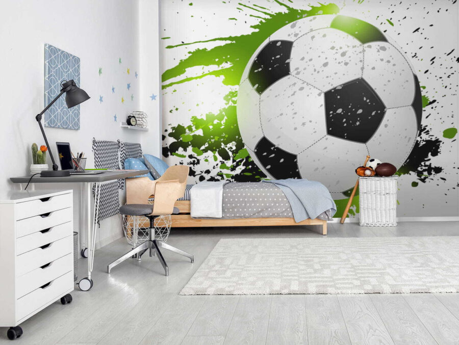 Bună ziua! Imaginează-ți asta – un strop de culori și o minge de fotbal care zboară chiar pe peretele tău. Asta veți obține cu pictura murală “Minge de fotbal cu stropi artistici”. Este ca și cum cineva a capturat momentul perfect, plin de acțiune al unui meci, l-a înghețat în timp, apoi a adăugat un pic de fler artistic. Stropirile verzi și negre îi dau un aer atât de viu și distractiv. Camera copilului dvs. se va transforma instantaneu într-un refugiu cool, sportiv. Și sincer, chiar și prietenii tăi ar putea să o invidieze! Practic, puteți auzi aplauzele și simți entuziasmul de fiecare dată când vă uitați la ea. Absolut grozav pentru tinerii fanatici ai fotbalului care visează mare, nu-i așa?