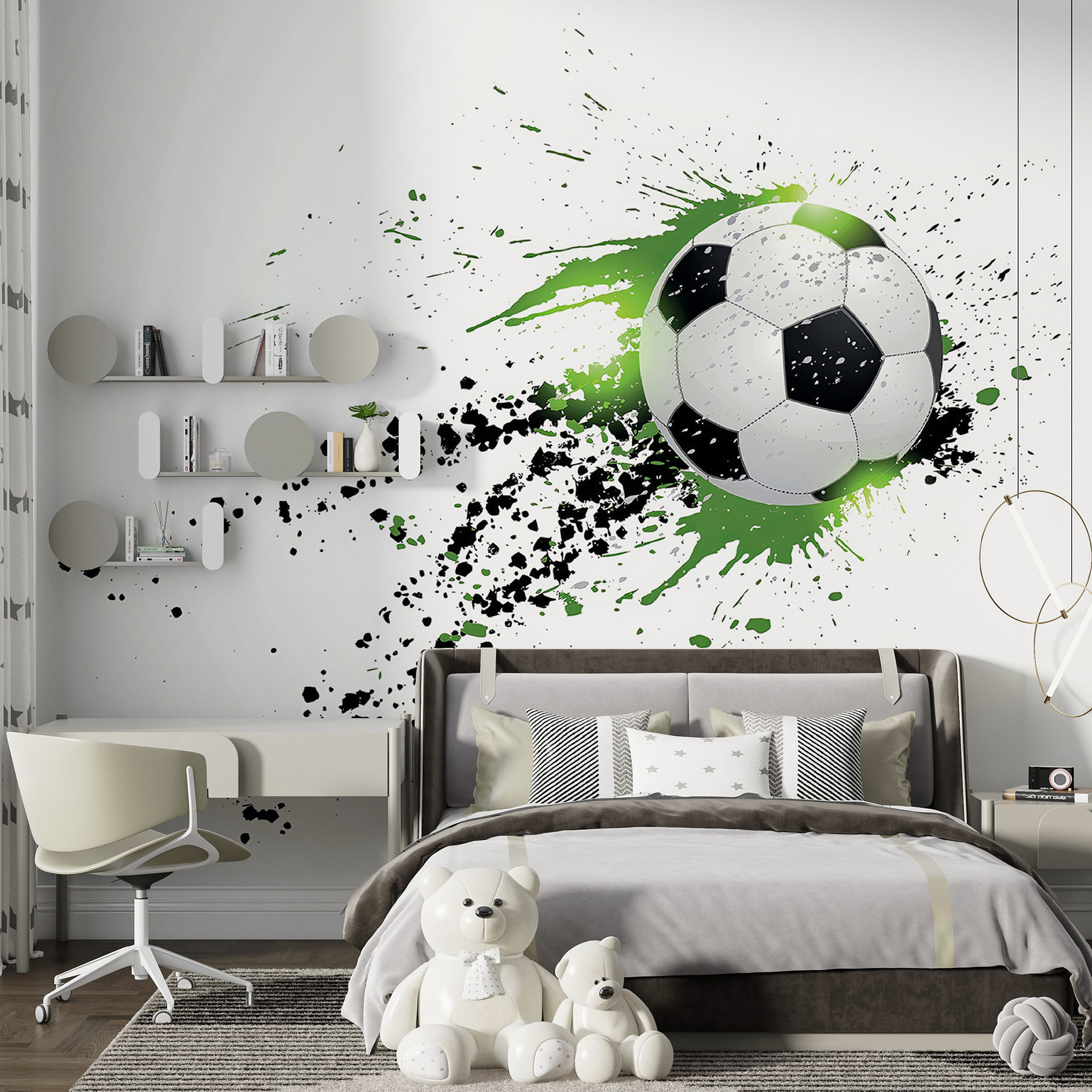Bună ziua! Imaginează-ți asta – un strop de culori și o minge de fotbal care zboară chiar pe peretele tău. Asta veți obține cu pictura murală “Minge de fotbal cu stropi artistici”. Este ca și cum cineva a capturat momentul perfect, plin de acțiune al unui meci, l-a înghețat în timp, apoi a adăugat un pic de fler artistic. Stropirile verzi și negre îi dau un aer atât de viu și distractiv. Camera copilului dvs. se va transforma instantaneu într-un refugiu cool, sportiv. Și sincer, chiar și prietenii tăi ar putea să o invidieze! Practic, puteți auzi aplauzele și simți entuziasmul de fiecare dată când vă uitați la ea. Absolut grozav pentru tinerii fanatici ai fotbalului care visează mare, nu-i așa?