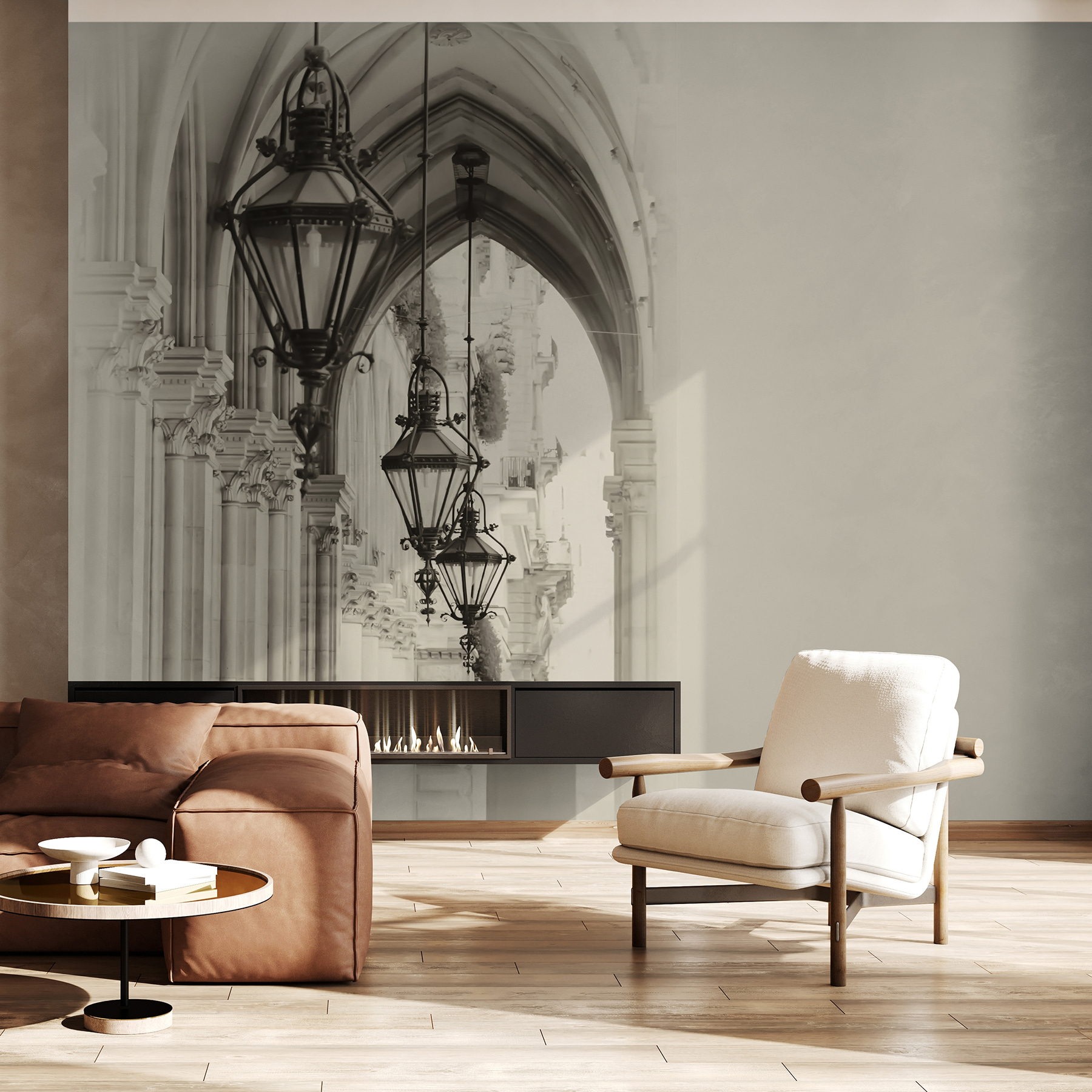 În regulă, imaginați-vă că intrați într-o cameră și sunteți purtați instantaneu într-un hol măreț, din lumea veche, ca acasă într-un oraș european clasic. Aceasta este magia acestui “perete mural obiect negru într-o cameră”. Aceste felinare atârnate în rânduri perfecte? Sunt ca niște santinele care păzesc istoria. Aproape că poți simți piatra rece sub picioare și auzi sunetele slabe ale străzii răsunând printre arcade. Este ca și cum ai avea o poartă secretă către trecut chiar în sufrageria ta. Estetica alb-negru adaugă acest vibe atemporal, aproape visător. Este perfect pentru a adăuga o notă de eleganță arhitecturală, fără a supraaprecia camera. De asemenea, este un bun subiect de conversație. Dacă pereții ar putea vorbi, acesta ar avea niște povești uimitoare. Acest amestec de profunzime 3D cu farmecul vintage face ca spațiile să pară nu doar mai mari, ci și mai intrigante, ca și cum ați fi deschis un cufăr cu comori urban. Perfect pentru cei care visează cu ochii deschiși și pentru toți cei care doresc ca pereții lor să aibă un pic de suflet.