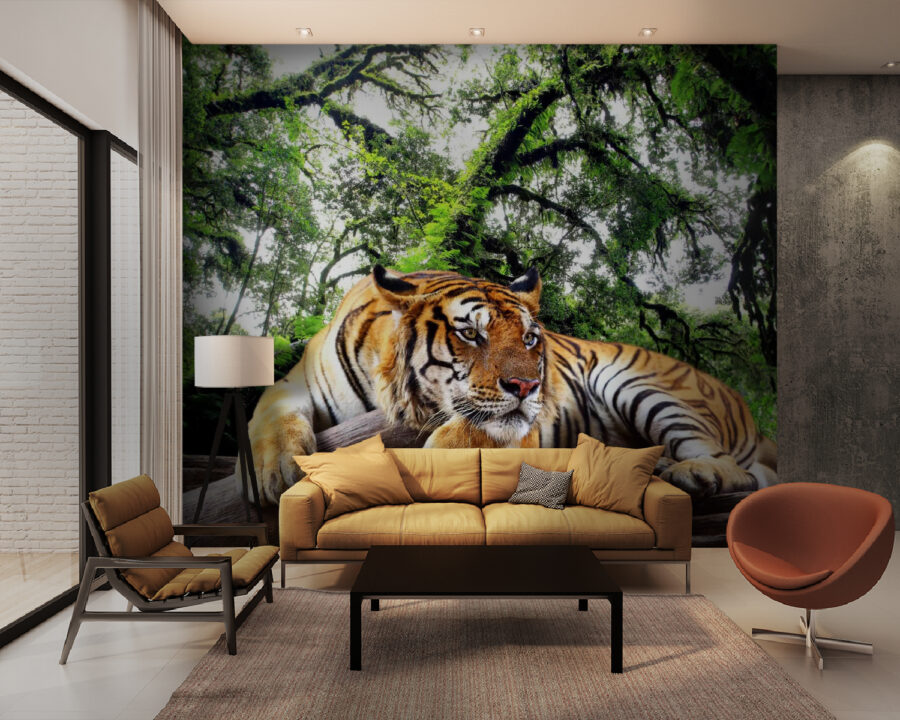 Transformați-vă spațiul cu acest uimitor fototapet „Tigru întins pe un buștean”. Imaginați-vă că intrați într-o cameră în care se odihnește un tigru maiestuos, aducând sălbăticia direct în casa dvs. Dungile sale vibrante și privirea pătrunzătoare creează o atmosferă calmă și aventuroasă în același timp, perfectă atât pentru visători, cât și pentru iubitorii de natură. Acest fototapet invită șoaptele junglei, făcându-vă să vă simțiți ca și cum ați împărtăși un moment de liniște cu această creatură magnifică. Este ca și cum ai avea o bucată din tropice chiar pe peretele tău, trezind un sentiment de uimire de fiecare dată când o privești. În plus, este excelent pentru a stârni conversații – oaspeții nu vor putea rezista să împărtășească poveștile lor preferate despre tigri!