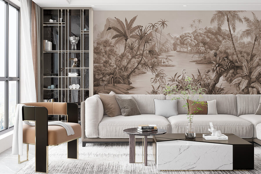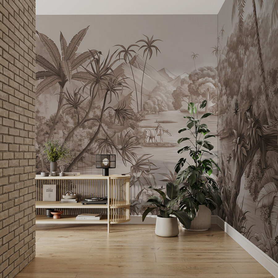 Transformați orice cameră într-o evadare tropicală cu această pictură murală uimitoare care prezintă o scenă vibrantă din junglă. Imaginați-vă că vă relaxați cu sunetele naturii care vă înconjoară, în timp ce animale grațioase se plimbă printre frunzișul luxuriant. Tonurile pământii și detaliile complicate ale acestei picturi murale creează o atmosferă senină, făcând fiecare privire să se simtă ca o mini-vacanță. Perfectă pentru un colț confortabil sau o cameră de familie plină de viață, aceasta invită la căldură și aventură. Imaginați-vă sorbind cafea în timp ce visați cu ochii deschiși la jungle sălbatice – cine nu și-ar dori asta? Aduceți o bucățică de natură în interior și priviți cum pereții dvs. prind viață!