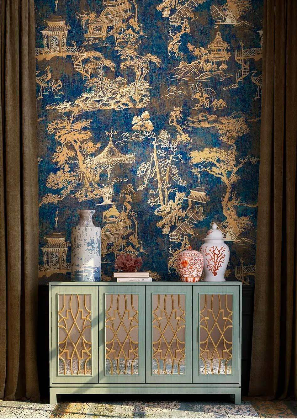 Transformați-vă spațiul cu acest tapet uimitor, cu modele complexe pe o pânză de un albastru intens. Imaginați-vă că pășiți într-o lume senină, în care păsări elegante zboară în jurul pagodelor pitorești, înconjurate de copaci luxurianți și peisaje liniștite. Este ca și cum ai avea o grădină zen liniștită chiar în sufrageria ta, fără a fi nevoie să ai mâna verde! Fiecare detaliu trezește curiozitatea, făcându-l un subiect perfect de conversație atunci când ai vizitatori. Nuanta de albastru intens creează o atmosferă primitoare, ideală pentru a te relaxa cu o carte bună sau pentru a savura un ceai. Cine ar fi crezut că arta murală poate fi atât de fermecătoare? Acest mural nu doar decorează un perete, ci aduce un sentiment de calm și uimire în orice cameră.