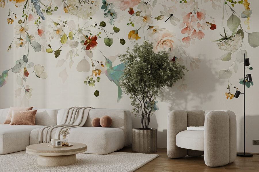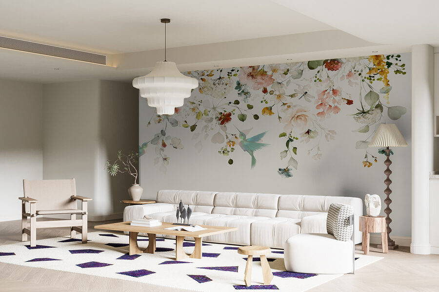 Această pictură murală are o frumusețe senină care este pur și simplu… liniștitoare. Aceste nuanțe pastelate și detaliile complicate? Emană o atmosferă confortabilă, dar elegantă. În plus, acea pasăre colibri – drăguță și capricioasă, nu? E ca și cum ai putea auzi zumzetul aripilor sale mici. Fie că vă relaxați cu o carte sau discutați cu prietenii, această pictură murală creează o scenă minunat de liniștită.