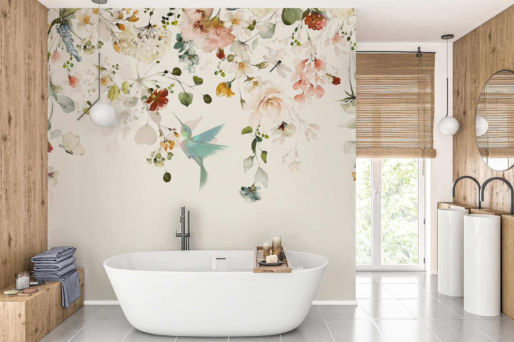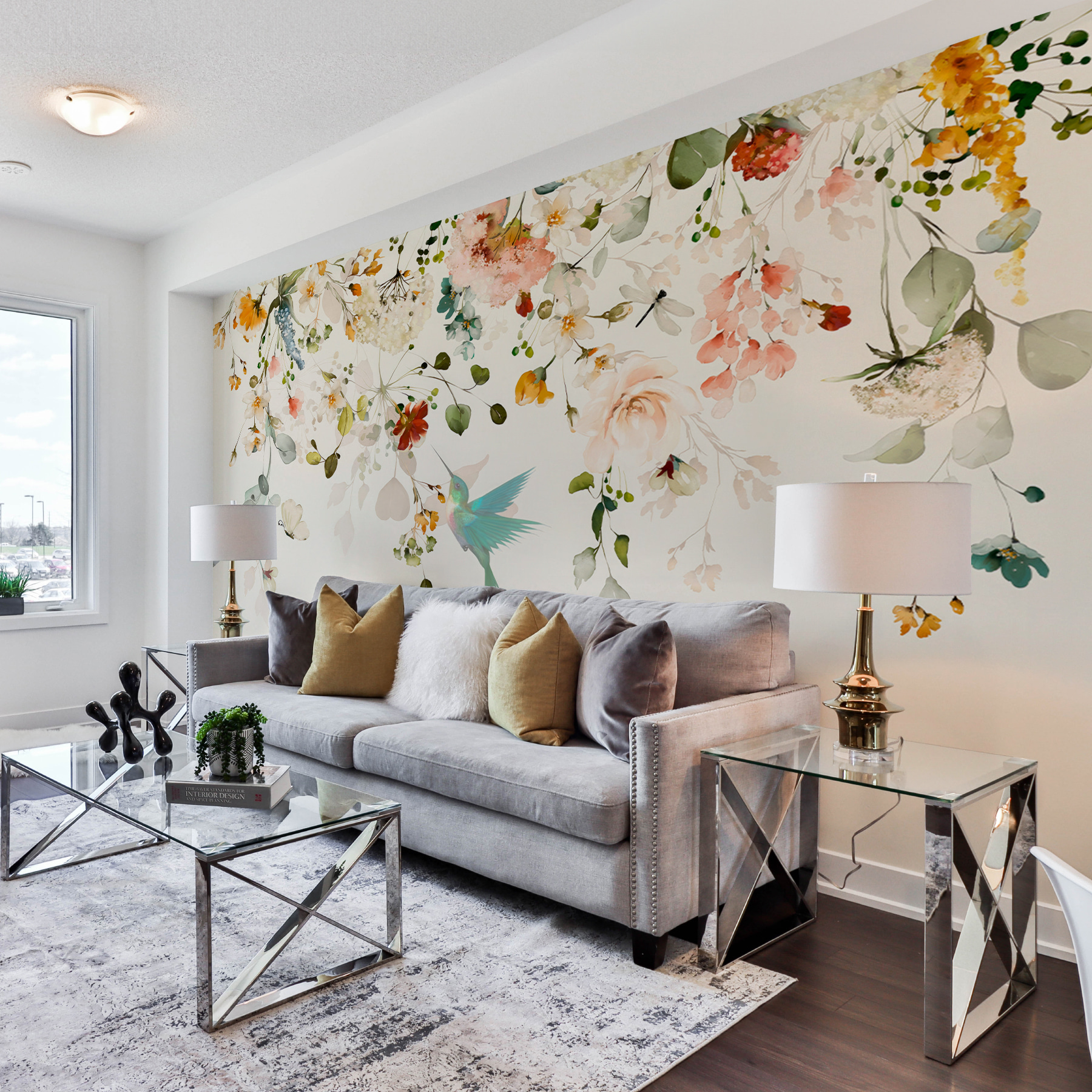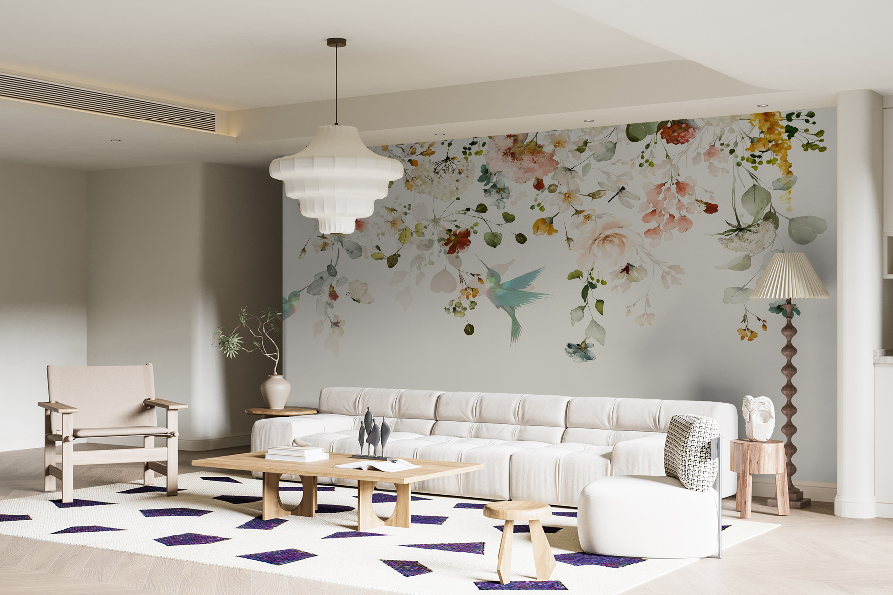 Această pictură murală are o frumusețe senină care este pur și simplu… liniștitoare. Aceste nuanțe pastelate și detaliile complicate? Emană o atmosferă confortabilă, dar elegantă. În plus, acea pasăre colibri – drăguță și capricioasă, nu? E ca și cum ai putea auzi zumzetul aripilor sale mici. Fie că vă relaxați cu o carte sau discutați cu prietenii, această pictură murală creează o scenă minunat de liniștită.