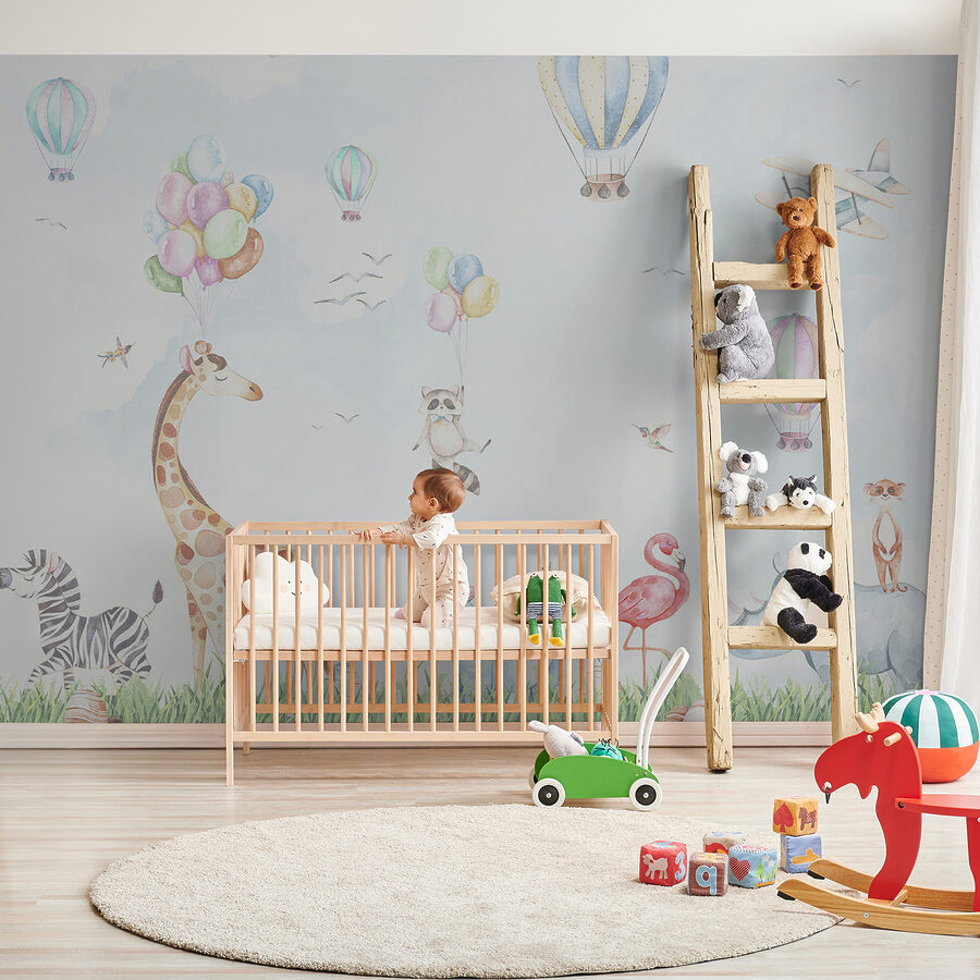 Căutați să decorați camera unui copil cu un strop de farmec? Aruncați o privire la această pictură murală adorabilă în care un rinocer, o vulpe și prietenii lor capricioși sunt în centrul atenției! Imaginați-vă un tărâm al minunilor senin, în acuarelă, plin de baloane cu aer cald, animale jucăușe și un cer care pare o îmbrățișare moale, de vis. Acest mural nu este doar frumos – este magic. Imaginează-ți asta: micuțul tău se trezește în fiecare dimineață într-un safari al zâmbetelor, cu o girafă ținând baloane și un raton gata să exploreze. Este ca o carte de povești care prinde viață, invitând la tot felul de aventuri și chicoteli. Perfect pentru a stârni creativitatea și a face ora de culcare un pic mai încântătoare. Adăugați această piesă încântătoare pe pereții dvs. și priviți cum se desfășoară bucuria!