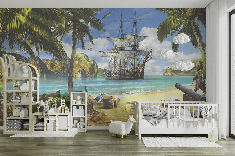 Transformați orice cameră într-o aventură plină de viață cu această pictură murală uimitoare. Imaginați-vă că intrați într-un spațiu în care culorile vibrante vă duc într-un paradis tropical, cu o corabie maiestuoasă și un pirat jucăuș care veghează! Această pictură murală nu este doar o decorațiune – este o poartă către imaginație. Copiilor le va plăcea amestecul de fantezie și entuziasm, în timp ce adulții și-ar putea aminti de vânători de comori și escapade îndrăznețe. Este ca și cum ai avea o mini-vacanță acasă! Transformați un perete obișnuit într-un decor uimitor care stârnește bucurie și creativitate de fiecare dată când treceți pe lângă el. Imaginați-vă – un colț de lectură confortabil sau o cameră de joacă pentru copii care se simte ca o călătorie, în fiecare zi.