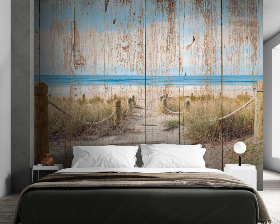 Imaginați-vă că intrați într-o cabană confortabilă pe plajă, chiar dacă sunteți acasă. Acest mural, cu acea potecă fermecătoare din lemn care duce direct la ocean, șoptește povești despre veri leneșe și brize sărate. E ca o mini-vacanță de fiecare dată când îl priviți, nu credeți? Lemnul uzat adaugă o notă de nostalgie, de parcă ar fi văzut nenumărate apusuri de soare. Imaginați-vă că sorbiți cafeaua de dimineață în timp ce priviți valurile blânde. Cine știe, poate vă va inspira să faceți o excursie spontană la plajă! Perfect pentru orice iubitor al mării care dorește să aducă un pic de calm, distracție și un strop de aventură în spațiul său.