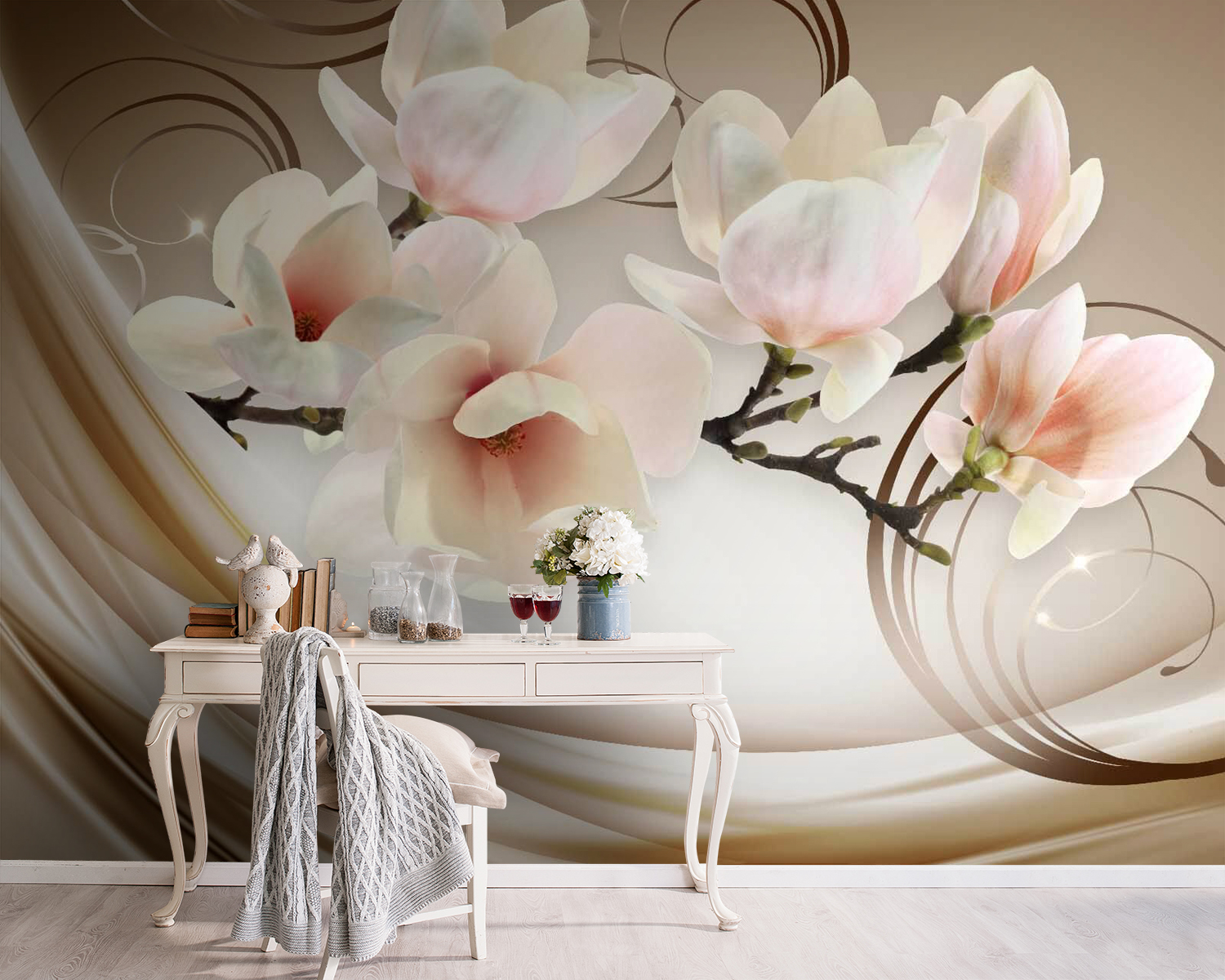 Transform any space with the enchanting “Delicate Blooms Against a Gentle Backdrop” mural. This piece isn’t just about flowers—it’s like a soft hug for your walls! Imagine waking up to petals that seem to float, whispering serenity all around. The light colors and smooth curves add a touch of elegance that feels fresh and airy, perfect for that cozy reading nook or a bright kitchen. Friends might just stop mid-sentence, mesmerized by the blooms. It’s like nature decided to take a seat in your living room. Talk about an artistic statement!