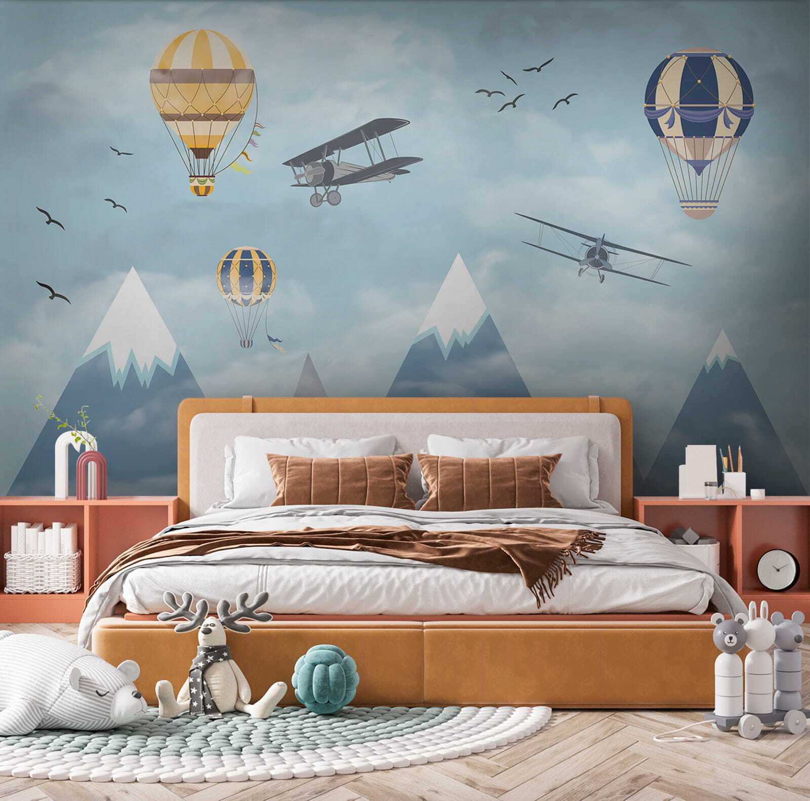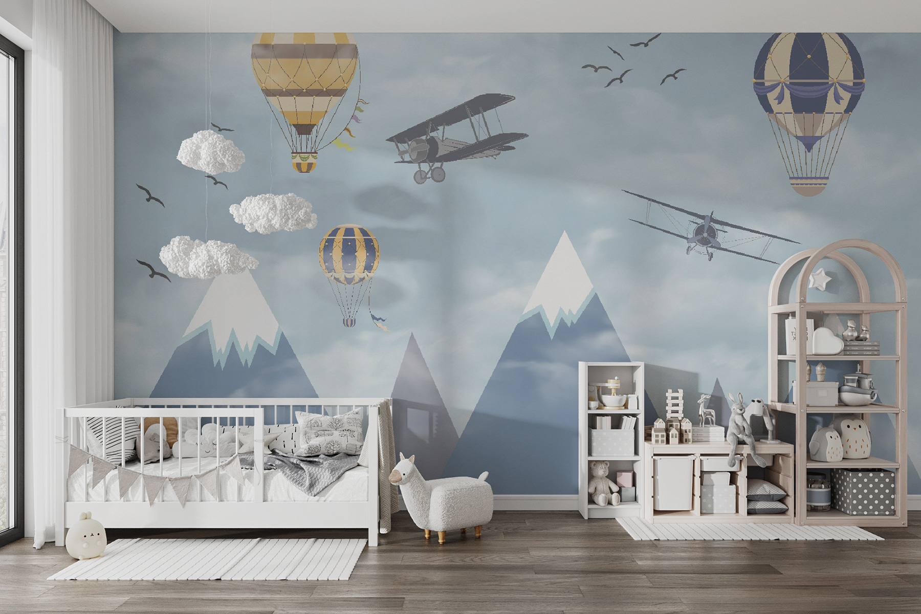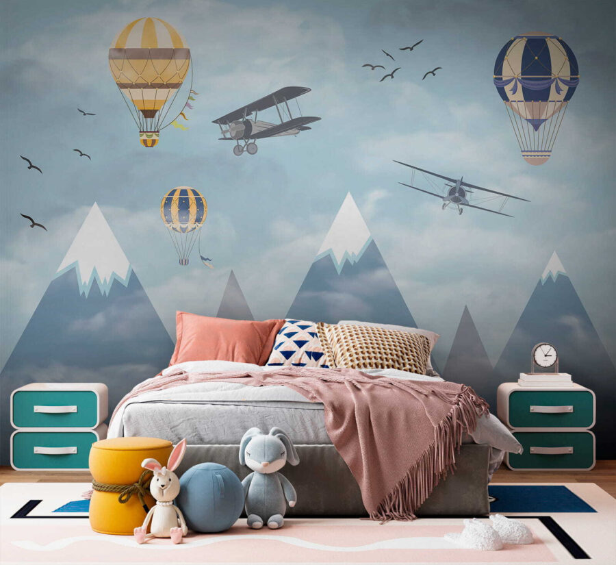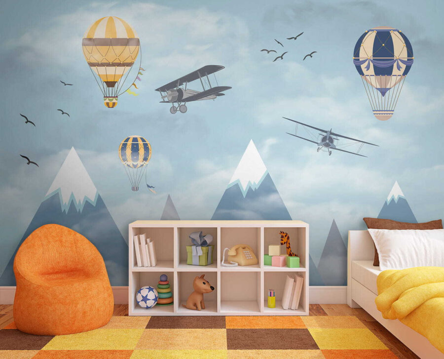 Imaginați-vă că vă treziți pe un cer plin de baloane cu aer cald capricioase care plutesc printre nori, alături de avioane aventuroase care trec pe lângă voi și păsări care zboară la înălțime – este magie pură! Pictura murală “Hot Air Balloon in the Sky” aduce un sentiment de uimire și aventură chiar în cameră. Perfectă pentru a stârni creativitatea și visele în spațiile copiilor, este ca și cum le-ai oferi o pânză pentru ca imaginația lor să zburde. Albastrul pastelat și norii moi sunt atât de liniștitoare, făcând ca spațiul să se simtă ușor și aerisit. Nu este vorba doar de decor – este o călătorie spre ceruri fără ca măcar să părăsiți camera. Părinții ar putea simți și ei un strop de nostalgie, amintindu-și de vise cu locuri îndepărtate și călătorii îndrăznețe. Cine nu și-ar dori un pic din asta în casa lor? În plus, acei munți acoperiți de zăpadă din fundal? Pur și simplu încântător. Această pictură murală este practic un vis cu ochii deschiși sub formă de artă murală – fermecătoare la infinit și frumos senină. Copiii o vor adora, la fel și copilul din tine.