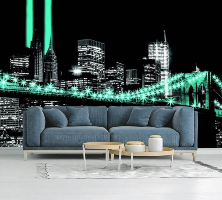 Transformați orice perete într-un decor captivant cu acest mural uimitor reprezentând un pod scăldat în lumini, perfect pentru cei care adoră atmosfera urbană. Imaginați-vă că intrați într-o cameră și sunteți întâmpinați de această priveliște electrizantă – este ca o mică bucată de magie urbană chiar la voi acasă. Contrastele bogate de negru și verde evocă o atmosferă confortabilă, dar vibrantă, făcându-l un fundal perfect pentru serile de film sau discuțiile târzii. Acest mural vă poate face să vă simțiți ca și cum ați pășit chiar în inima unui oraș care nu doarme niciodată. Cine are nevoie să călătorească când peretele vostru vă poate transporta în altă parte?