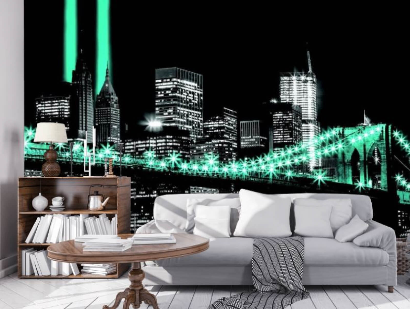 Transformați orice perete într-un decor captivant cu acest mural uimitor reprezentând un pod scăldat în lumini, perfect pentru cei care adoră atmosfera urbană. Imaginați-vă că intrați într-o cameră și sunteți întâmpinați de această priveliște electrizantă – este ca o mică bucată de magie urbană chiar la voi acasă. Contrastele bogate de negru și verde evocă o atmosferă confortabilă, dar vibrantă, făcându-l un fundal perfect pentru serile de film sau discuțiile târzii. Acest mural vă poate face să vă simțiți ca și cum ați pășit chiar în inima unui oraș care nu doarme niciodată. Cine are nevoie să călătorească când peretele vostru vă poate transporta în altă parte?