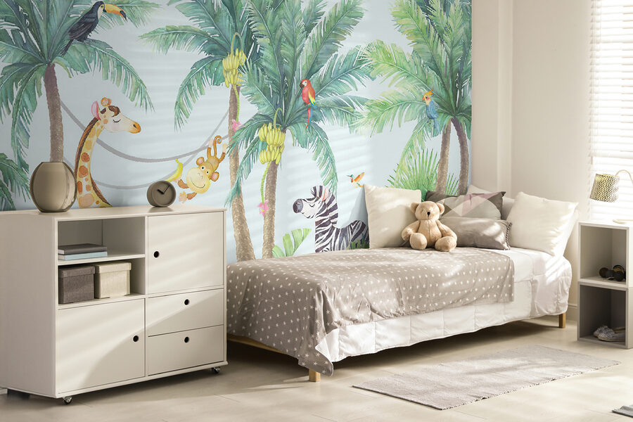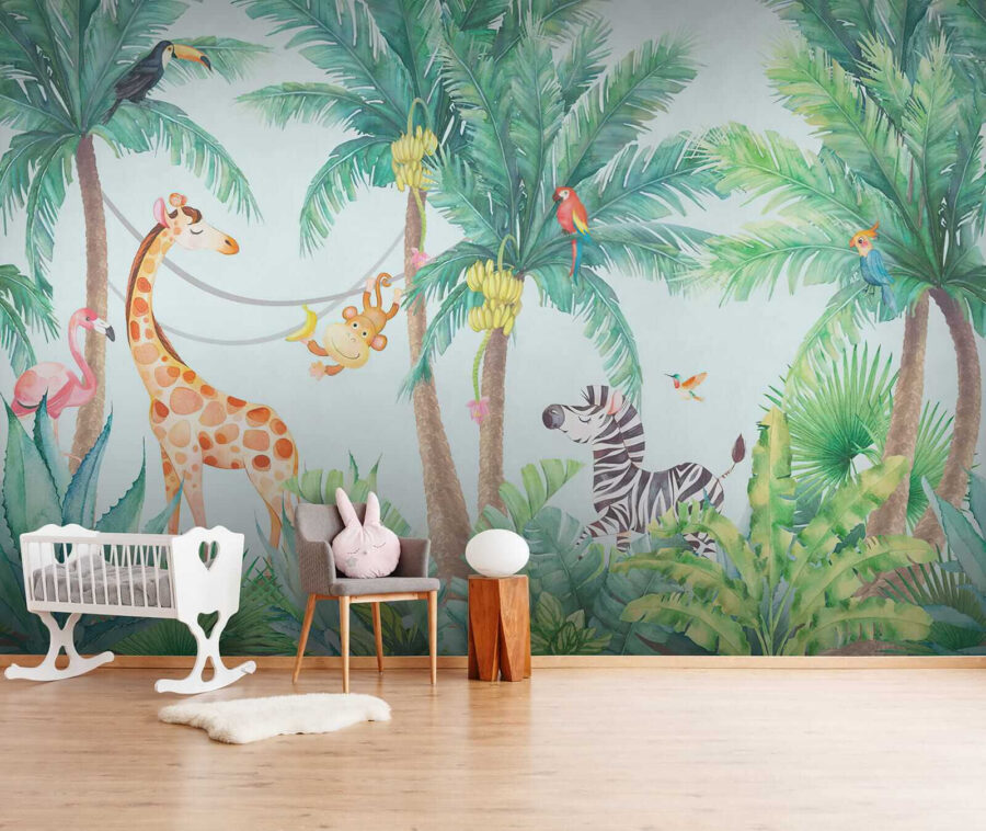 Înveseliți camera copilului dvs. cu acest încântător “Fototapet Tropical Animals Enjoying the Jungle Vibes!” Imaginați-vă această scenă: maimuțe obraznice care se leagănă de liane, o girafă prietenoasă și o zebră care pare foarte relaxată – toate înconjurate de palmieri verzi și luxurianți. Este ca și cum ai avea un mini safari în junglă chiar la tine acasă! Perfect pentru a stimula dragostea pentru natură și animale în rândul micilor exploratori. Și sincer, cine nu și-ar dori să se trezească în fiecare dimineață cu un flamingo care îi salută? Această pictură murală aduce o explozie de bucurie și aventură, făcând orice spațiu să se simtă viu și fericit.