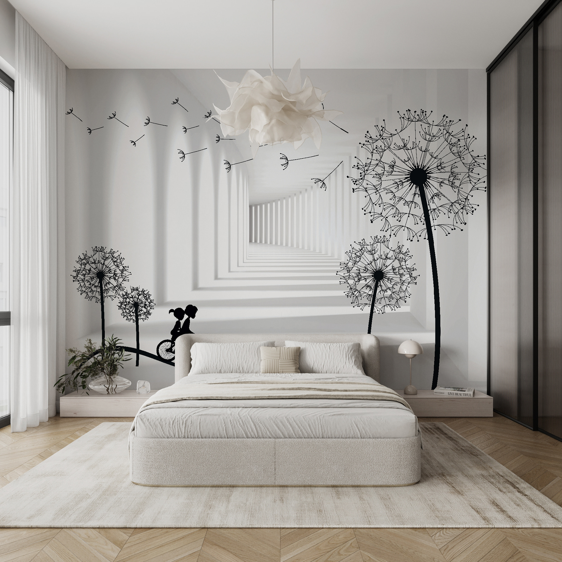 Transformați-vă spațiul cu această pictură murală capricioasă cu un băiat și o fată care merg pe bicicletă printr-un peisaj de vis cu păpădii. Siluetele jucăușe invită la un sentiment de libertate și aventură, stârnind amintiri despre zilele copilăriei lipsite de griji și plimbările însorite. Imaginați-vă că vă treziți în fiecare dimineață, plăcut surprinși de această scenă veselă care adaugă un strop de farmec pereților dumneavoastră. Este ca și cum ai aduce o felie de nostalgie în casa ta. Perfectă pentru camere de zi, camere de joacă sau chiar pentru micul colț de lectură, această pictură murală nu este doar un decor, ci o călătorie încântătoare care așteaptă să se întâmple!
