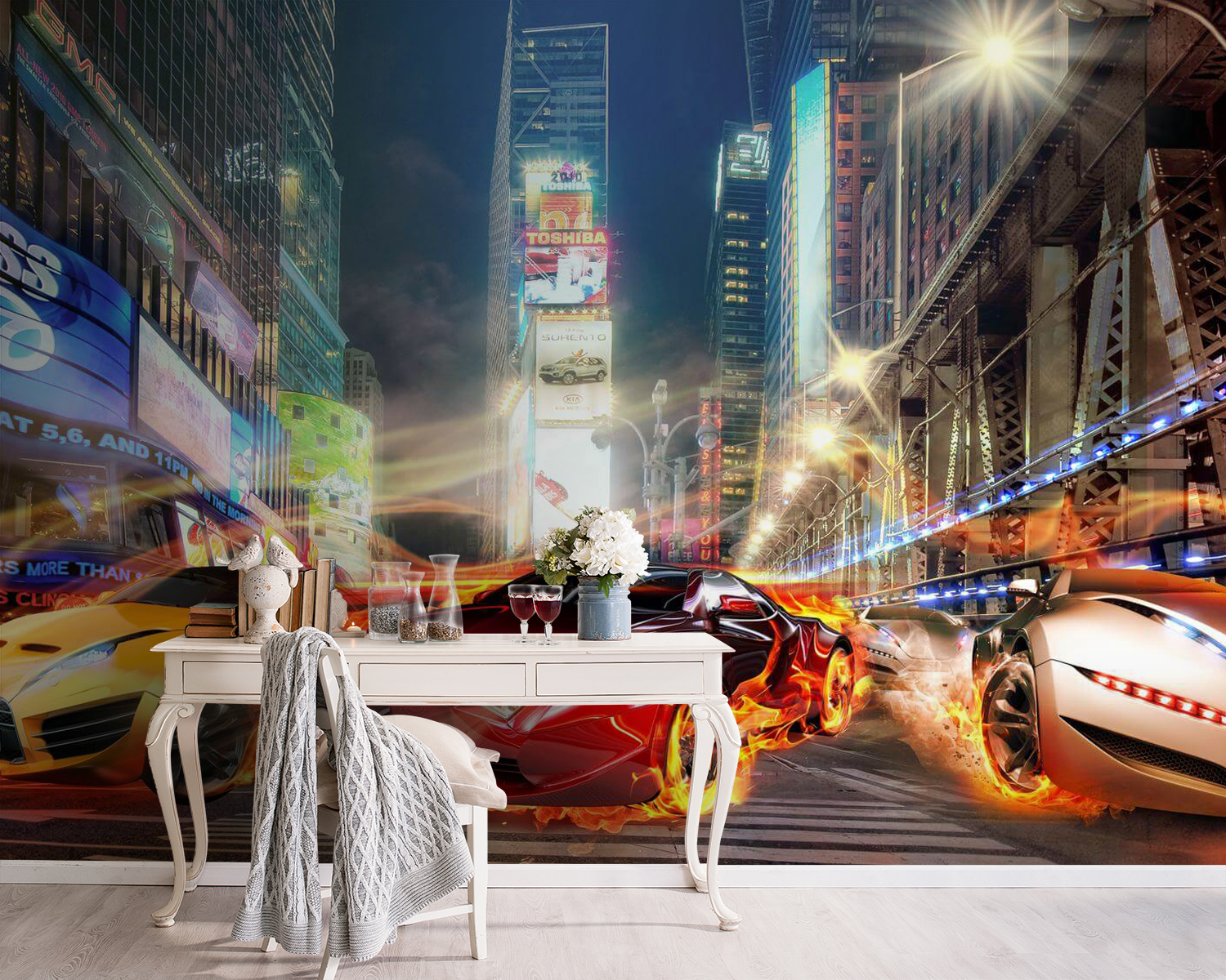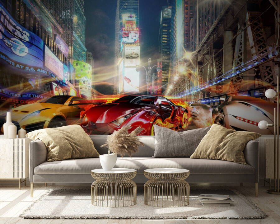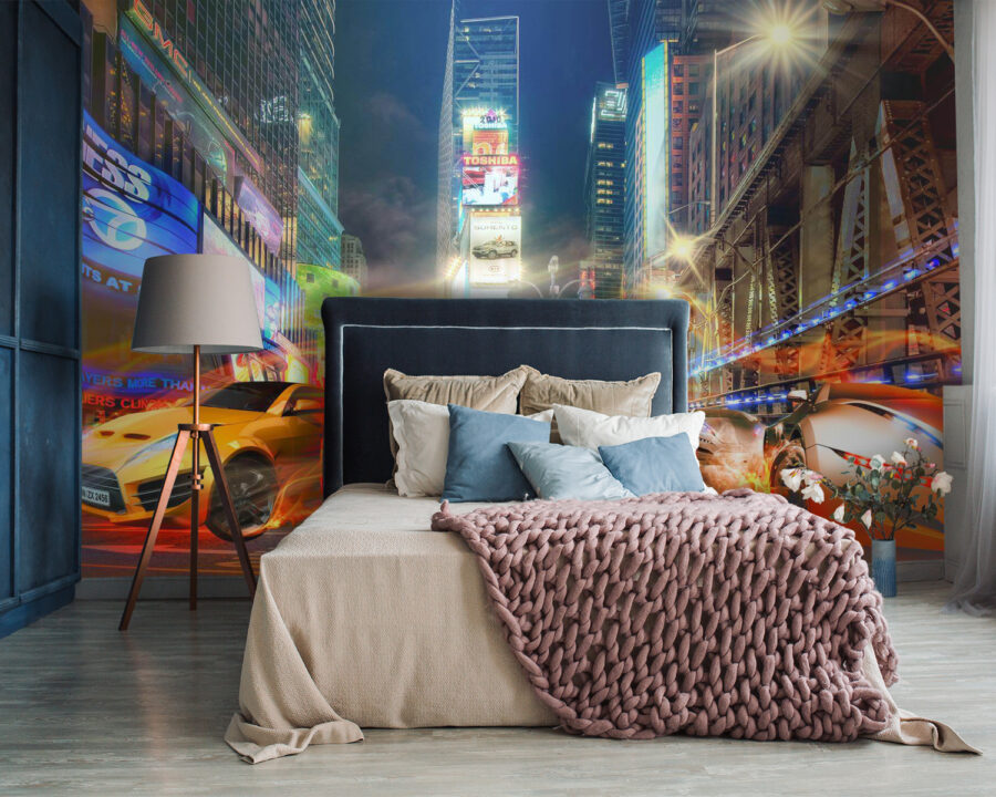 Ai un copil pasionat de viteză sau poate că și tu ești un pic nebun după mașini? Aruncați o privire la această pictură murală răcoroasă a unei mașini sport roșii care pare să ia foc – la propriu! Este ca și cum ai face o oprire la boxe în mijlocul unei curse de mare viteză prin inima orașului. Imaginați-vă că fiul sau fiica dvs. se simte ca un mini-pilot de curse de fiecare dată când intră în camera lor. Energia și flăcările sar practic de pe perete, amplificând adrenalina. Perfect pentru o cameră de joacă sau o peșteră pentru bărbați. Pregătiți-vă să intrați într-un stil de decor serios!