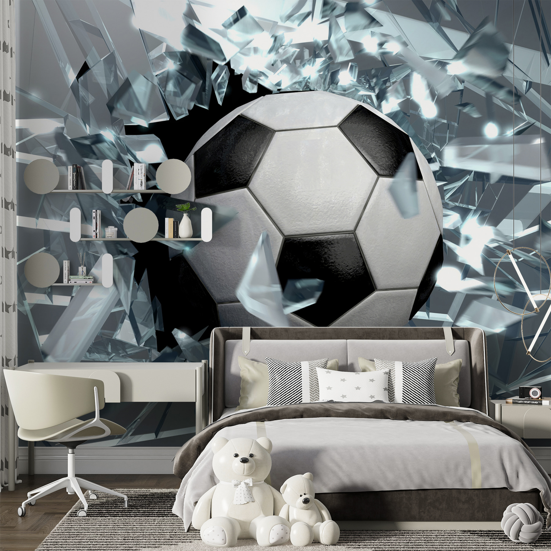 Transformând o cameră într-o aventură vibrantă, această pictură murală aduce energia palpitantă a fotbalului direct pe peretele dvs. Imaginați-vă o minge de fotbal puternică care izbucnește printr-o barieră imaginară, cioburile de sticlă stârnind o vibrație plină de viață. Este ca și cum spațiul tău tocmai a marcat golul suprem, ceea ce îl face perfect pentru copiii care visează să devină superstaruri pe teren. Imaginează-ți – prietenii vin, ochii se măresc și întrebările zboară. Ce copil nu s-ar simți ca un campion cu această scenă dinamică? Este mai mult decât un simplu decor; este inspirație, emoție și multă distracție!