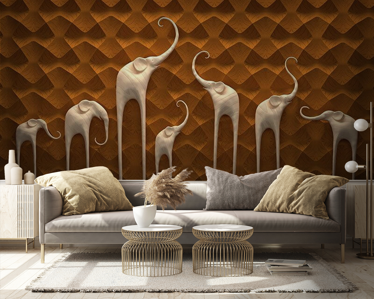 Transformați orice spațiu cu acest fototapet încântător, care prezintă o paradă încântătoare de elefanți. Acești uriași blânzi, redăți într-o manieră artistică, vor aduce un sentiment de fantezie și căldură în casa dvs. Imaginați-vă că intrați într-o cameră și simțiți că ați pășit într-un safari liniștit, unde singurele sunete sunt foșnetul ușor al frunzelor și trompetele îndepărtate ale elefanților. Perfect pentru camera unui copil sau pentru o zonă de living confortabilă, acest fototapet stârnește imaginația și devine un subiect de conversație instantaneu. Fiecare elefant are un caracter unic, aproape ca și cum ar împărtăși povești din aventurile lor. Fie că este vorba de o după-amiază relaxantă cu o carte sau o întâlnire animată cu prietenii, acest fototapet creează o atmosferă jucăușă, dar elegantă. Pregătiți-vă pentru zâmbete, nostalgie și poate câteva vise cu ochii deschiși despre rătăcirea prin sălbăticie!