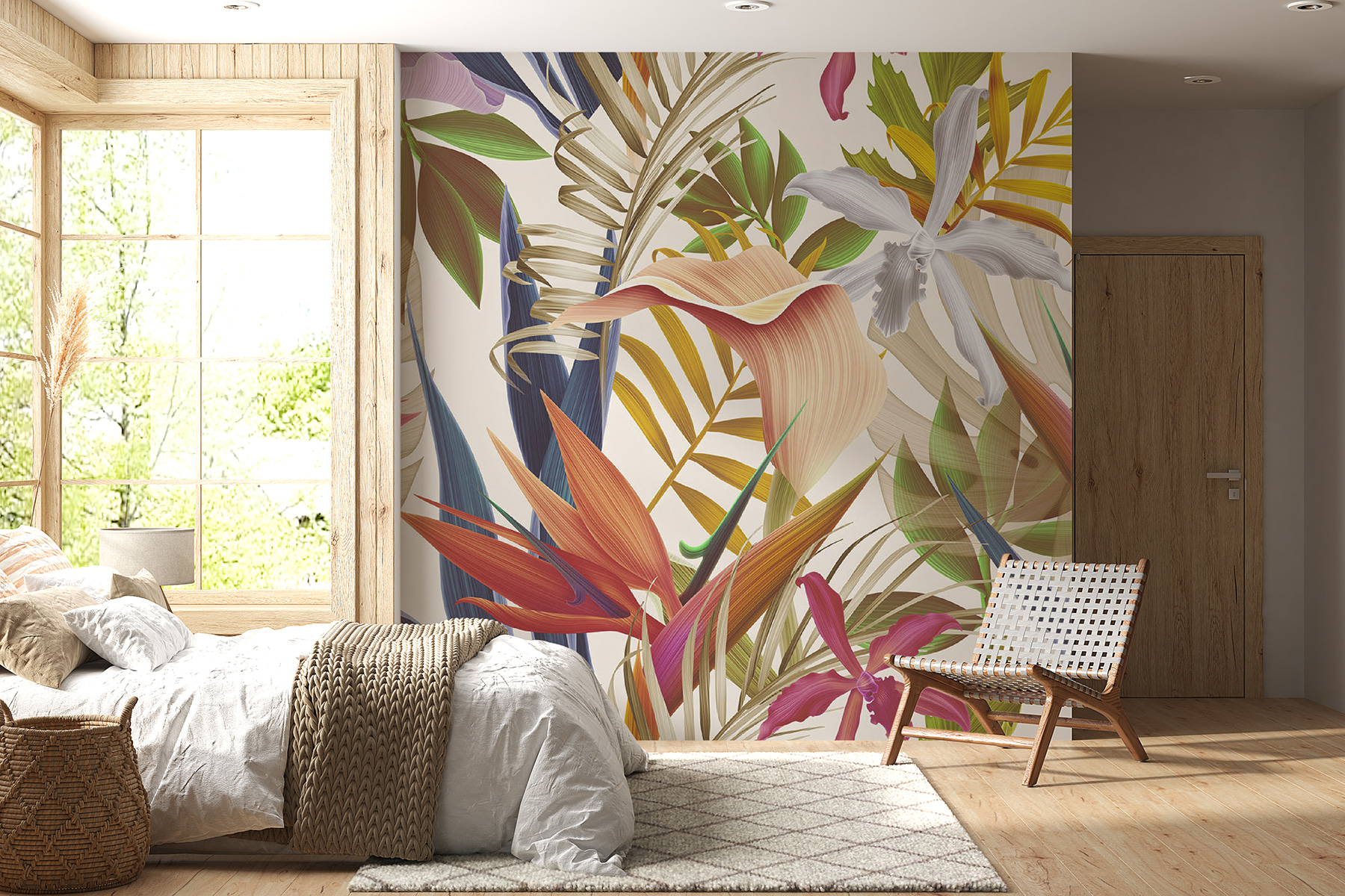 Transformați orice cameră într-un paradis vibrant cu această pictură murală orbitoare de frunze și flori tropicale colorate. Imaginați-vă – pășiți în spațiul dvs. și vă simțiți ca și cum tocmai ați intrat într-o grădină luxuriantă. Nuanțele bogate ies în evidență pe orice fundal, creând o atmosferă primitoare căreia este greu să îi rezistați.
