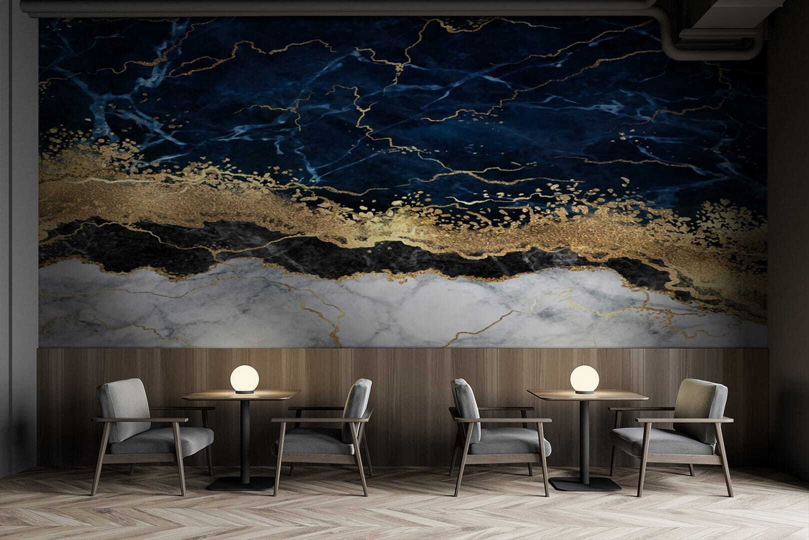 Transformați un perete tern în ceva cu adevărat captivant cu această pictură murală, Midnight Marbled with Shimmering Veins. Imaginați-vă că pășiți într-o cameră în care albastrul profund se învârte împreună ca marea la miezul nopții, cu vene care par să pulseze și să danseze. Este ca și cum ai avea o bucată de natură înfășurată în jurul spațiului tău, aducând un vibe liniștitor, dar izbitor.