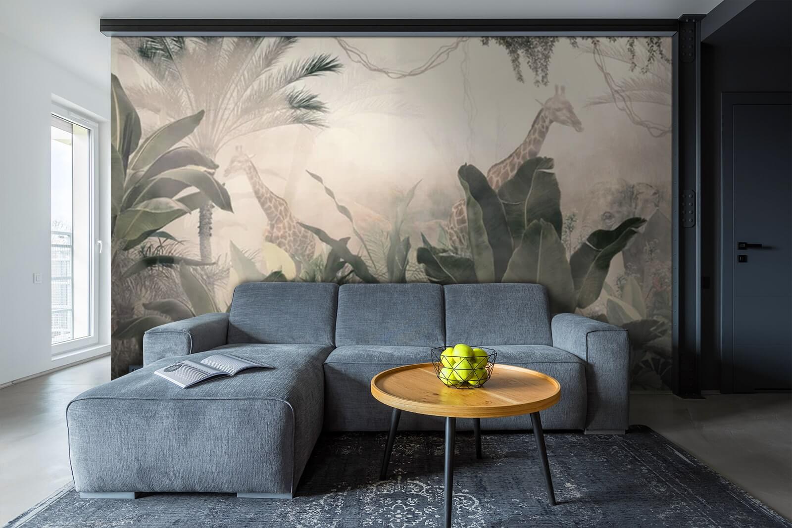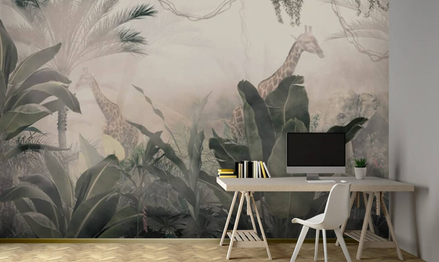 Transformați-vă spațiul într-o junglă capricioasă cu acest mural care prezintă girafe grațioase care se uită printre vegetația luxuriantă. Este ca și cum ați păși într-un vis în care natura domnește suprem. Imaginați-vă: beți cafeaua dimineața, razele soarelui pătrund prin fereastră, iar pe perete se află o girafă liniștită, care mănâncă frunze. Cine mai are nevoie de safari, nu-i așa? Straturile de frunziș creează un sentiment de profunzime, făcând camerele mici să pară mai spațioase. Este un subiect de conversație – oaspeții se vor opri cu siguranță să admire. Perfect pentru sufletele aventuroase sau pentru oricine dorește să evadeze din viața de zi cu zi. Un strop de magie, chiar acasă!