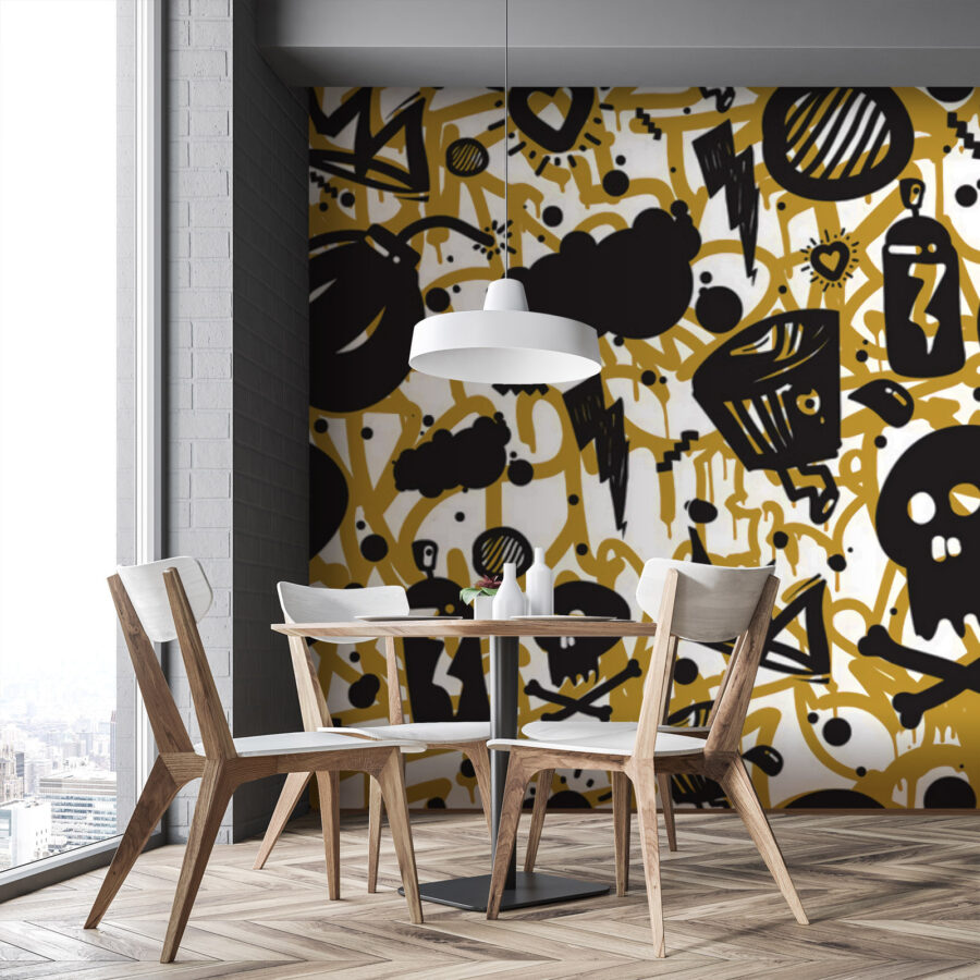 This wall mural is like a visual party, bursting with personality and creative energy. Picture this: the vibrant yellow backdrop jumps out at you, while funky black doodles, from cute skulls to zany crowns, dance across the surface. It’s edgy yet playful—perfect for anyone looking to inject some serious fun into their space. Imagine hosting friends, and they can’t help but chat about this mural, snapping photos like it’s the star of the show. It’s not just decor; it sparks joy and conversation! Hang it up, kick back, and watch your walls come alive with character. Who knew a little graffiti could transform a room into a playful wonderland?