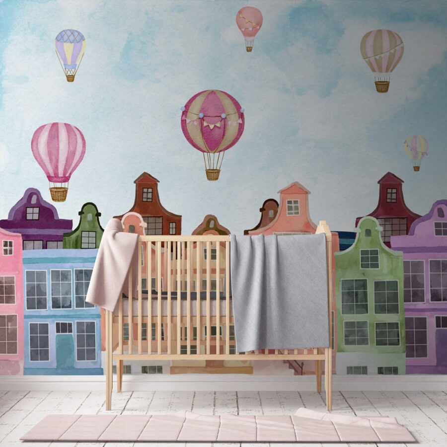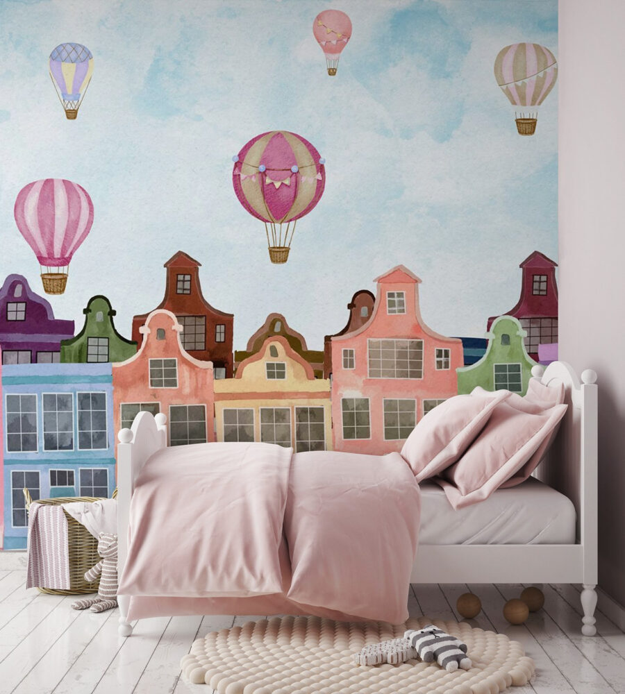 Fiecare privire aruncată asupra acestui fototapet te poate duce într-o mini-evadare. Imaginează-ți că bei cafeaua în timp ce aceste clădiri vibrante te privesc vesel, făcând diminețile banale să pară speciale. Sau imaginează-ți cum această frumusețe ar putea inspira povestiri în timpul reuniunilor de familie – fiecare are propria aventură cu baloane. Cu amestecul său fermecător de culori, acest fototapet îți va ridica fără efort moralul, la fel ca baloanele cu aer cald care plutesc într-o zi însorită. Perfect pentru un colț confortabil sau pentru acel perete care pare puțin singuratic, nu este doar un decor – este o experiență care așteaptă să se întâmple.