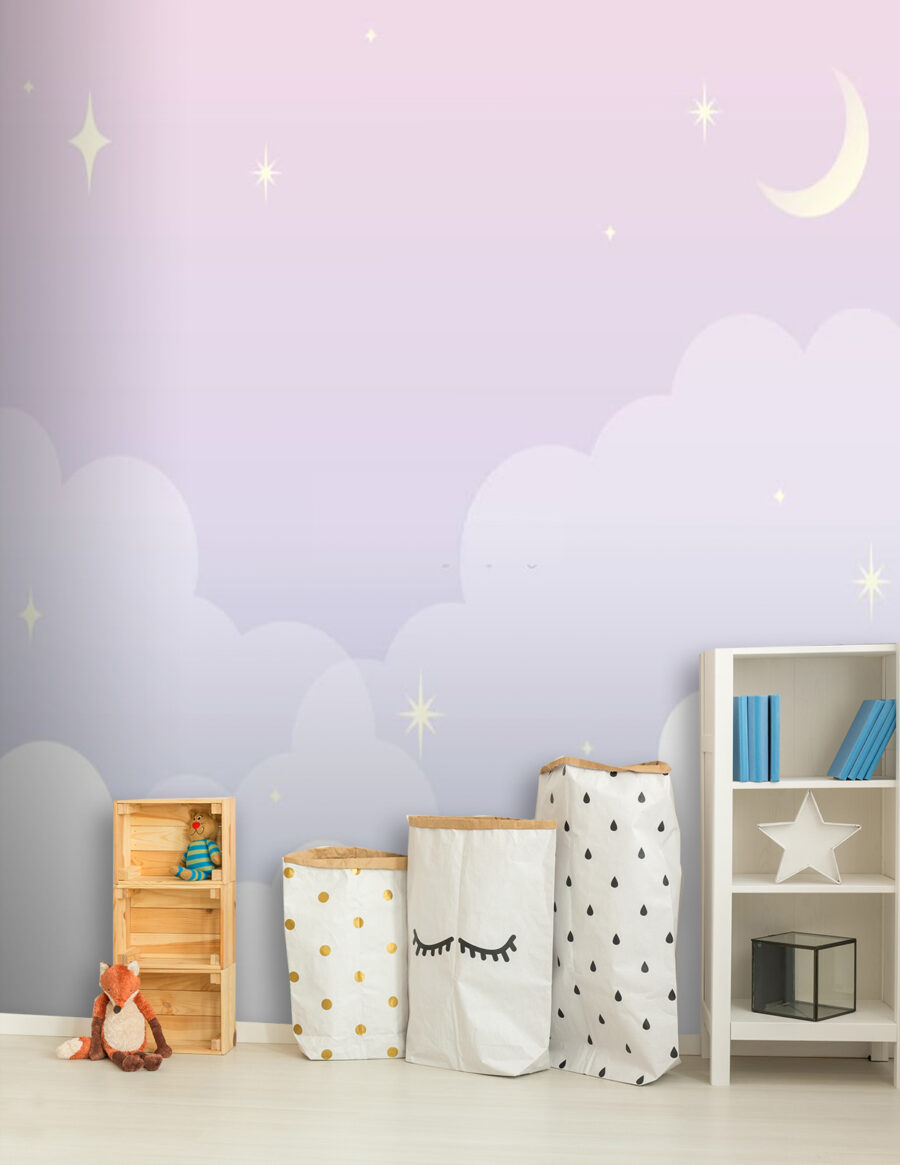 Imaginați-vă un spațiu în care micuțul dvs. poate visa printre cei mai moi nori – Fototapet u72088 duce orice cameră de copil la un cu totul alt nivel! Cu pasteluri delicate care se amestecă într-un cer crepuscular, presărat cu stele sclipitoare și o lună în semilună blândă, este ca și cum ai trăi în interiorul unui cântec de leagăn. Liniștitoare și încântătoare, această pictură murală creează atmosfera calmă perfectă pentru poveștile de culcare sau somnul de după-amiază. Nu este doar un decor – este o invitație la imaginație! O singură privire și s-ar putea să vă doriți să fiți din nou copil, doar pentru a adormi sub acest cer senin. Cozy, frumos și ușor magic… Practic, visele sunt făcute din asta!