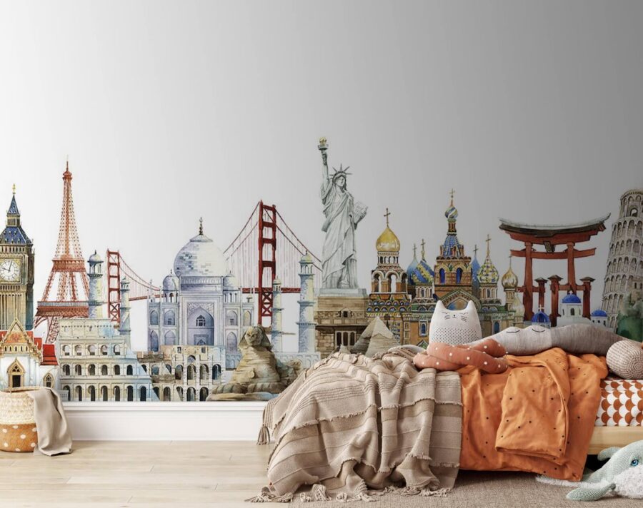 Transformați un perete gol într-o escapadă de vis cu această pictură murală vibrantă în acuarelă cu repere iconice. Imaginați-vă sorbind cafea în timp ce priviți Turnul Eiffel sau visând cu ochii deschiși la Taj Mahal – această pictură murală invită fiecare vizitator să exploreze minunile lumii chiar de acasă. Fiecare tușă surprinde spiritul călătoriei, făcând-o să se simtă ca o mică aventură în camera dvs. de zi. Această pictură murală nu este doar decor; ea stârnește povești și amintiri calde. Perfectă pentru sufletele dornice de călătorii sau pentru oricine iubește un bun festin vizual – este ca o invitație deschisă la explorare!
