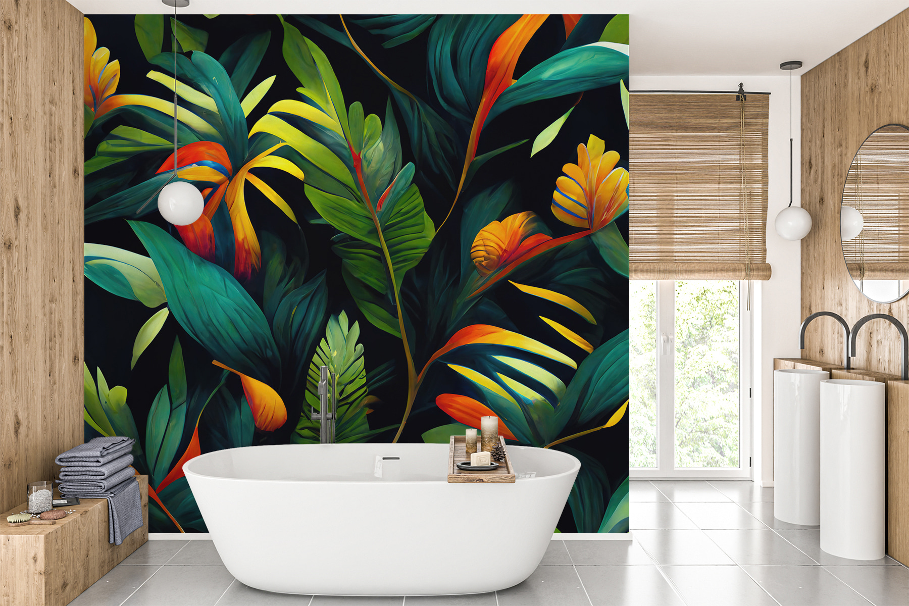 1 recenzie pentru Fototapet Frunze și flori tropicale vibrante