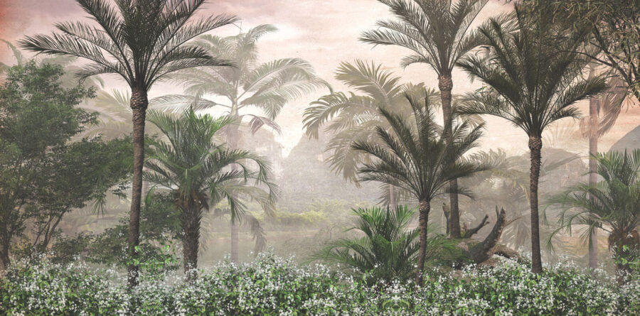 Pictura murală “Dimineață senină în paradisul tropical” – nu-i așa că numele este atrăgător? Imaginați-vă că vă treziți în această scenă liniștită, chiar în camera dvs. de zi. Verzi vii, flori delicate și palmieri impunători, toate învăluite într-o ceață de dimineață moale. Este ca și cum ai păși în propria ta junglă privată, fără să părăsești canapeaua.