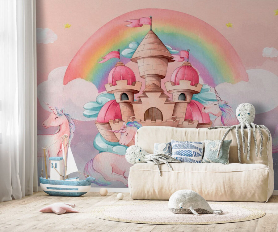 Detaliile încântătoare – cum ar fi coșul cu mâncare pe care un unicorn îl poartă cu dezinvoltură – adaugă o notă jucăușă care stârnește imaginația. Ne putem imagina o petrecere de vis cu ceai chiar lângă castel, sub un cer plin de stele sclipitoare și nori pufoși. Pastelurile blânde încălzesc inima, făcând din pictura murală o piesă centrală confortabilă și primitoare. Nu este doar un decor de perete; este o poartă către visuri cu ochii deschiși și aventuri.