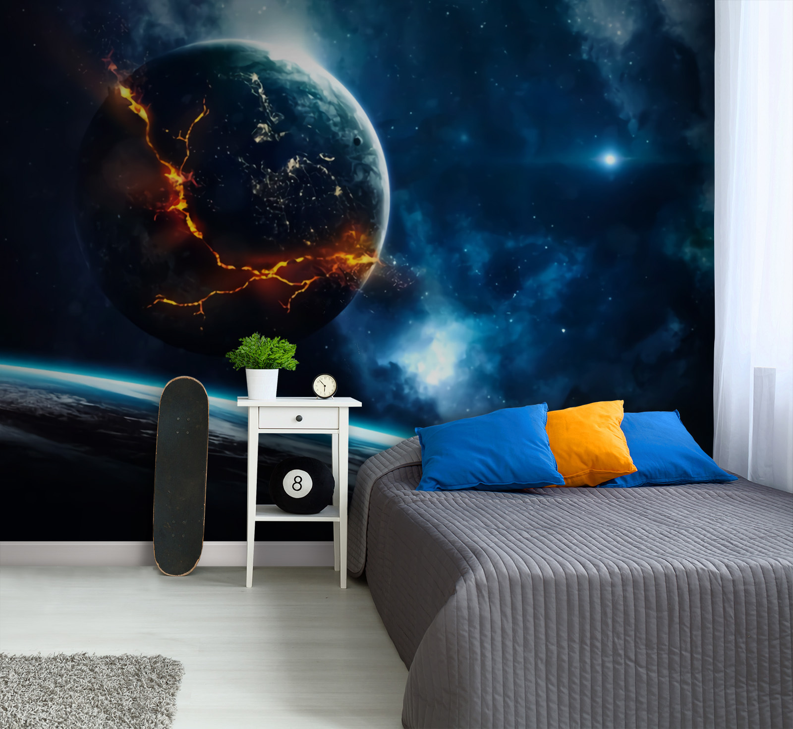 Imaginați-vă că vă treziți în fiecare zi în fața acestei uimitoare scene cosmice – cât de tare este? Peretele nostru mural “Planeta cu foc în fundal” aduce frumusețea dramatică a unei galaxii chiar în sufrageria dvs. (sau în biroul dvs., sau oriunde doriți să adăugați un strop de farmec ceresc). Această pictură murală nu este doar extrem de vibrantă, ci pare aproape vie, cu acea planetă în flăcări care pocnește în albastrul profund și misterios al galaxiei. Este ca și cum ai avea o fereastră spre un alt univers, care stârnește uimire, curiozitate și, poate, un pic de visare cu ochii deschiși la aventuri îndepărtate. Fie că sunteți pasionat de astronomie sau pur și simplu iubiți decorul îndrăzneț și unic, această piesă va stârni discuții. Oaspeții dvs. ar putea chiar să simtă o conexiune cosmică mai puternică. Și să fim sinceri, cui nu i-ar prinde bine un pic mai multă magie în viața lor? Perfectă pentru cei care apreciază vastitatea impresionantă a spațiului cu o atingere de foc!