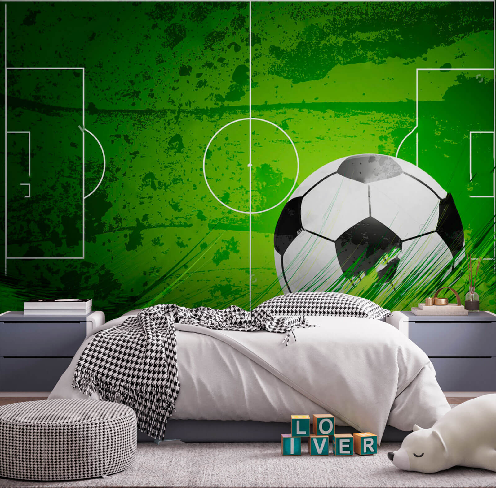 Transform any room into a vibrant play zone with this “Wall Mural Football Ball on a Green Field.” Picture this: game day, excitement buzzing in the air. This mural brings that energy right into your space, capturing the thrill of a perfect kick and the rush of a last-minute goal. The lush green backdrop and striking ball remind everyone that life is a game—full of joy, teamwork, and maybe a little friendly competition. It’s like having a mini stadium on your wall, perfect for inspiring both little athletes and just as passionate fans. Add some character to your walls and let the good vibes roll!