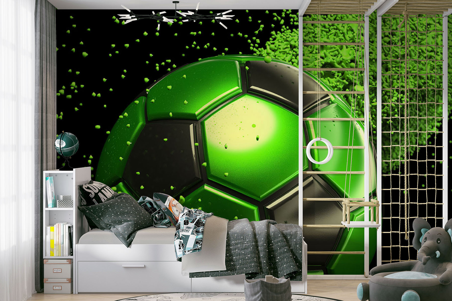 Transformați orice spațiu cu această pictură murală jucăușă cu hexagoane verzi și negre presărate cu puncte mici. Este ca o explozie de energie care aduce entuziasmul de pe terenul de fotbal chiar în casa dvs. Imaginați-vă acest lucru: prietenii se adună pentru ziua meciului, iar în loc de pereți goi, sunt întâmpinați de acest design plin de viață. Este fundalul perfect pentru niște discuții aprinse – poate chiar și pentru o mică rivalitate amicală. Culorile vibrante vă vor face să visați la goluri câștigătoare și la momente emoționante. Faceți din pereții dvs. subiect de discuție în oraș și lăsați vibrațiile bune să circule!