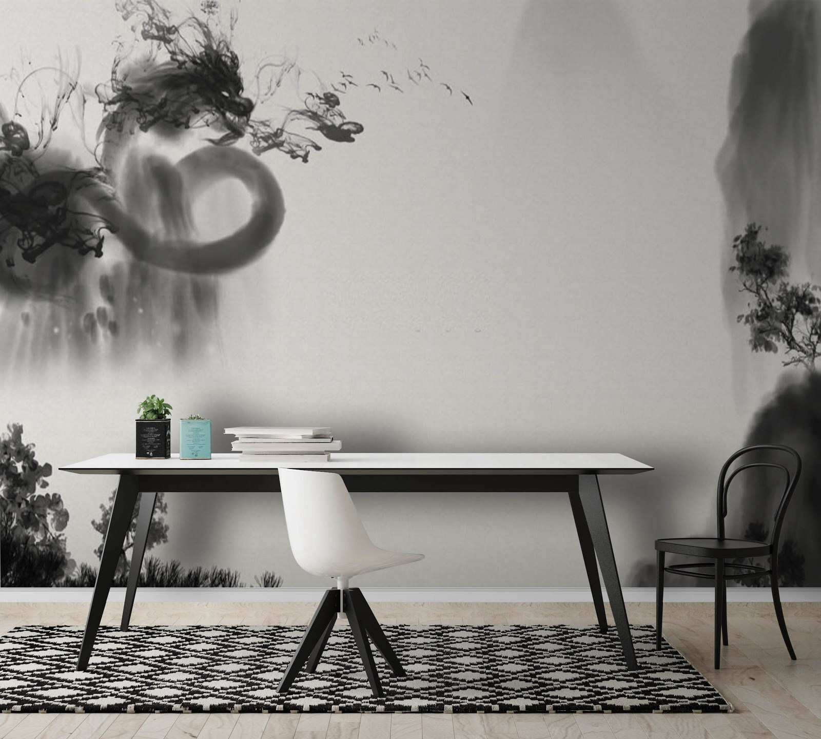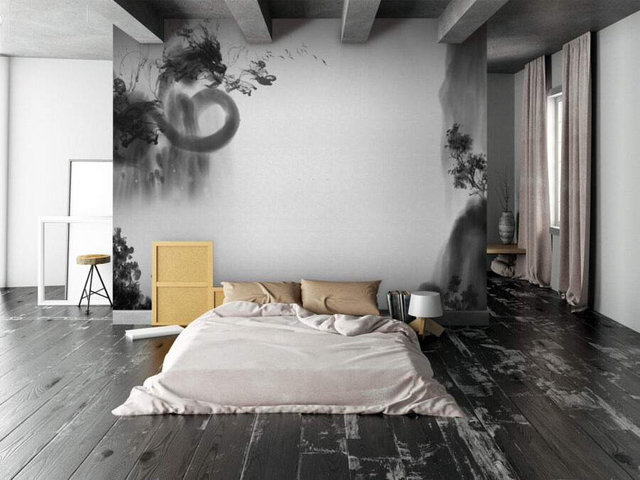 Uită-te la această pictură murală cool în alb și negru! Este un fel de amestec de clasic și artistic. Imaginați-vă că intrați într-o cameră și sunteți întâmpinați de această scenă misterioasă, aproape de vis. Are acest aspect care te face să te gândești la cerneala fumurie care se învârte pe hârtie, cu accente de peisaje și forme abstracte care se amestecă.