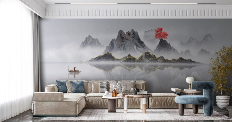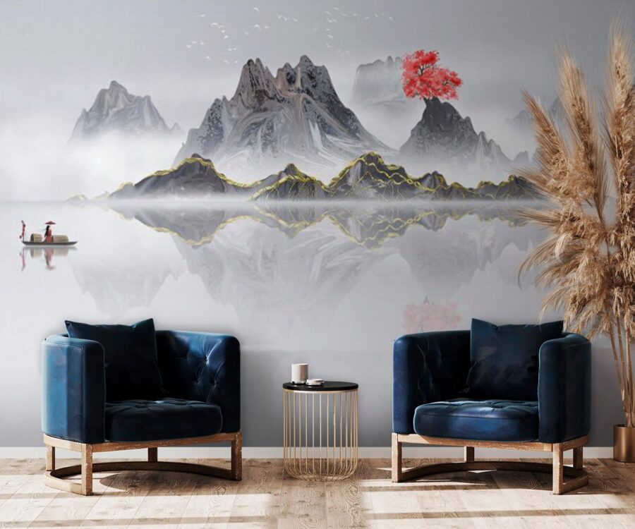 Transformați orice cameră cu acest tapet uimitor, care prezintă un lanț muntos maiestuos și un copac roșu impresionant pe fundalul unei ape liniștite. Este ca și cum ați avea o evadare pașnică chiar în casa dvs. Imaginați-vă că vă relaxați cu o ceașcă de ceai, lăsând scena senină să vă cuprindă.