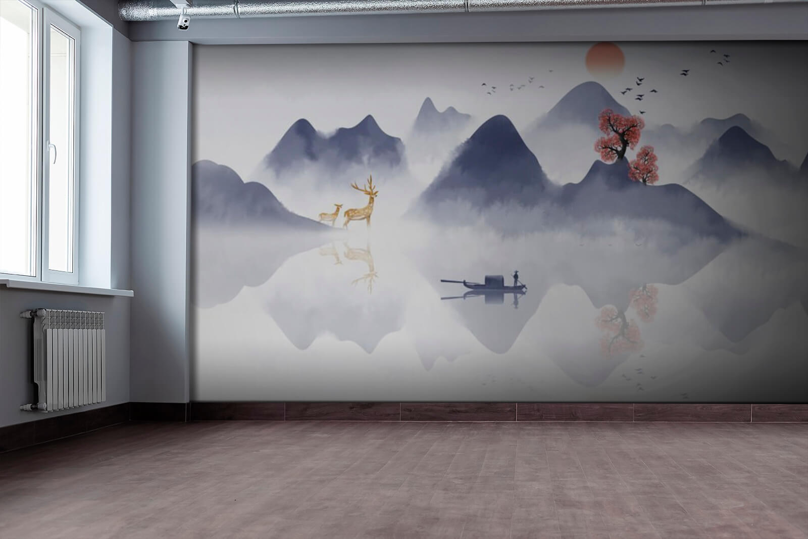 Transform any room into a serene escape with this stunning wall mural. Featuring a tranquil boat gliding through a foggy forest, surrounded by majestic mountains and vibrant trees, it invites you to daydream a little. Imagine sipping coffee while the morning sun peeks over the horizon, casting soft hues on the water. It’s like a mini-vacation every time you walk by. Perfect for those cozy corners or an office that could use some zen vibes. Plus, there’s a deer—because who wouldn’t want a little wildlife watching without leaving the house? Embrace that natural charm!
