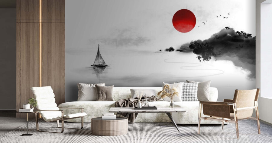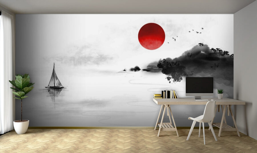 Imaginați-vă că intrați într-o cameră și sunteți întâmpinați de o scenă atât de liniștită – această pictură murală de vis înfățișează un cerc roșu pe un fundal alb senin. Este ca și cum ai avea propria ta mică operă de artă Zen. Soarele roșu, îndrăzneț, iese în evidență, oferind o pată de culoare revitalizantă greu de ignorat. Împreună cu peisajul moale, cețos, se obține echilibrul perfect între calm și vibrant.