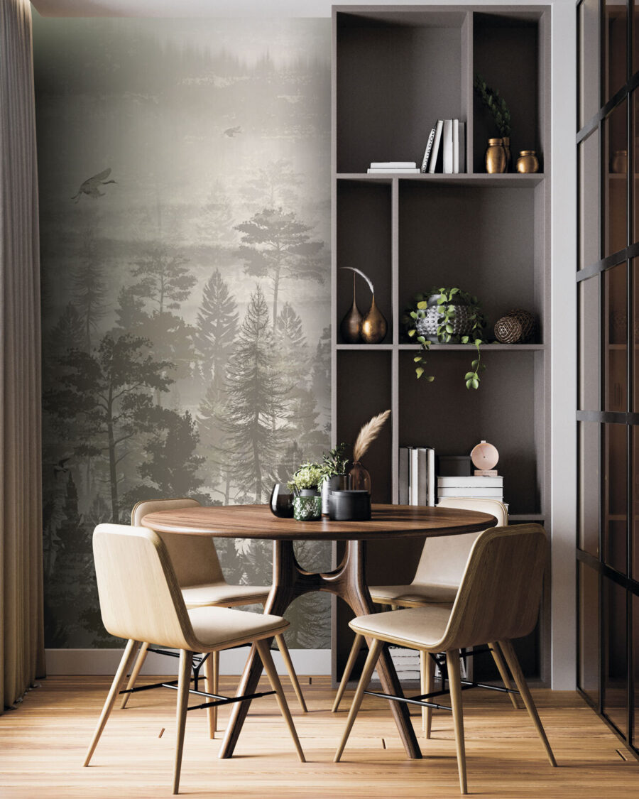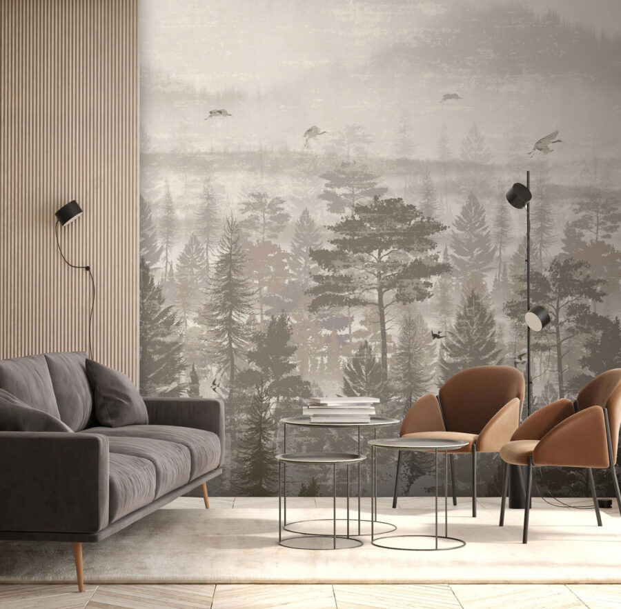 Transformați-vă spațiul cu acest mural uimitor cu păsări zburând deasupra unei păduri liniștite. Este ca și cum ați avea o bucată de natură chiar în sufrageria dvs. – fără țânțari, desigur. Culorile moi și discrete evocă o atmosferă calmă, făcându-l fundalul perfect pentru momente confortabile, fie că savurați o cafea sau vă cufundați într-o carte bună. Imaginați-vă că vă treziți cu această priveliște liniștită, unde fiecare privire pare o mini-evadare în pădure. Este tocmai ceea ce trebuie pentru cei care iubesc un strop de aventură amestecat cu un pic de eleganță. Perfect pentru orice iubitor de natură sau pentru oricine este gata să-și îmbunătățească decorul!