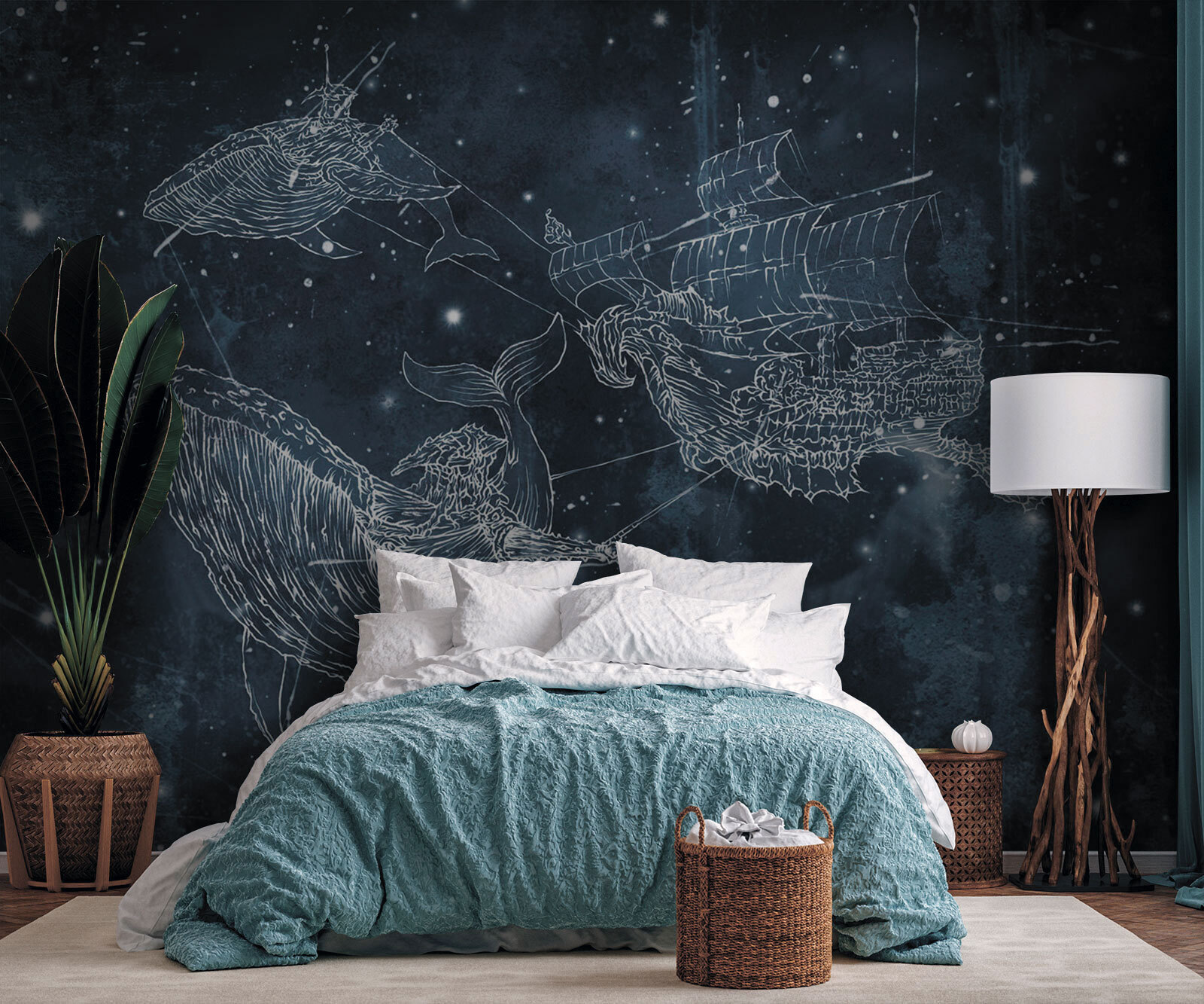 Imaginați-vă că vă treziți cu o balenă care vă cântă serenade de pe perete! Această pictură murală “Desenul unei balene” este ca o scufundare într-o mare magică – nu este un decor de perete obișnuit. Perfect pentru copiii care visează la aventuri marine și pentru adulții cu inima tânără care doresc să adauge un strop de minune oceanică spațiului lor. Un amestec de stele, balene și o navă misterioasă navighează prin albastrul amurgului, creând un peisaj nocturn capricios. Este ca o poveste de adormit copiii care prinde viață. Lăsați această scenă încântătoare să vă ducă pe tărâmul viselor sau să pornească orice cameră pe un val de creativitate și uimire. Navigați!
