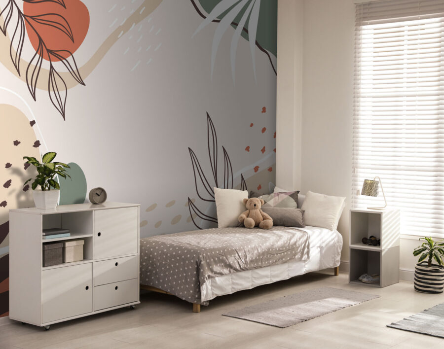 Știți sentimentul de calm și creativitate pe care îl aveți la o plimbare în natură? Imaginați-vă că îmbuteliați acest sentiment și îl stropiți direct pe pereți. Asta face această pictură murală “Abstract Leaves and Shapes”. Este ca o gură de aer proaspăt, dar, știi tu, în interior. Liniile fluide și formele organice sunt atât de liniștitoare pentru ochi – perfecte pentru a transforma orice perete simplu într-o mică oază.